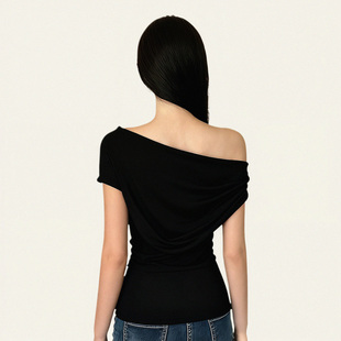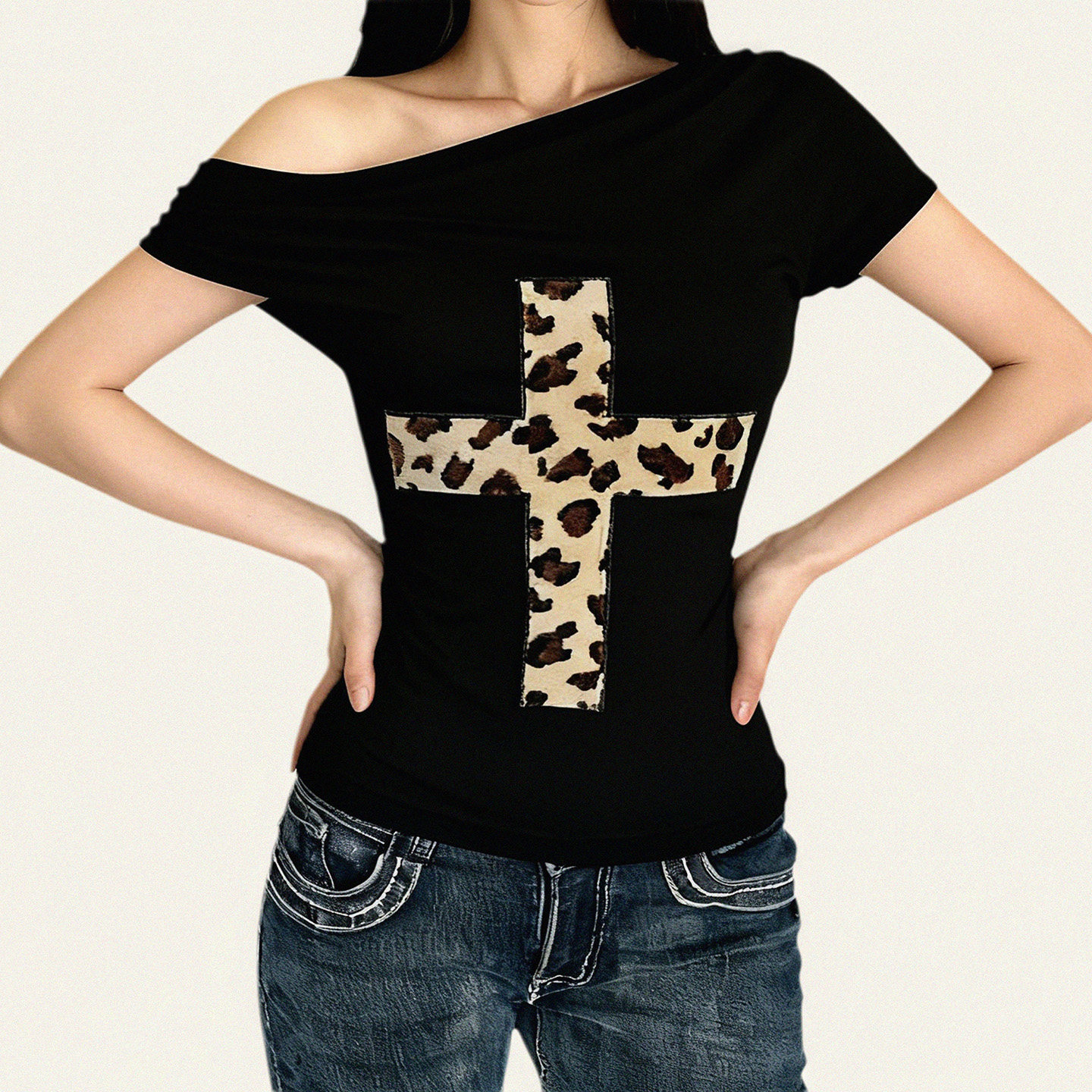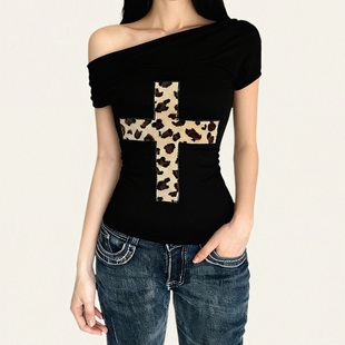 T恤轻亚修身 复古豹纹十字架黑色斜肩短袖 收腰露肩上衣 美式 FUNOFF