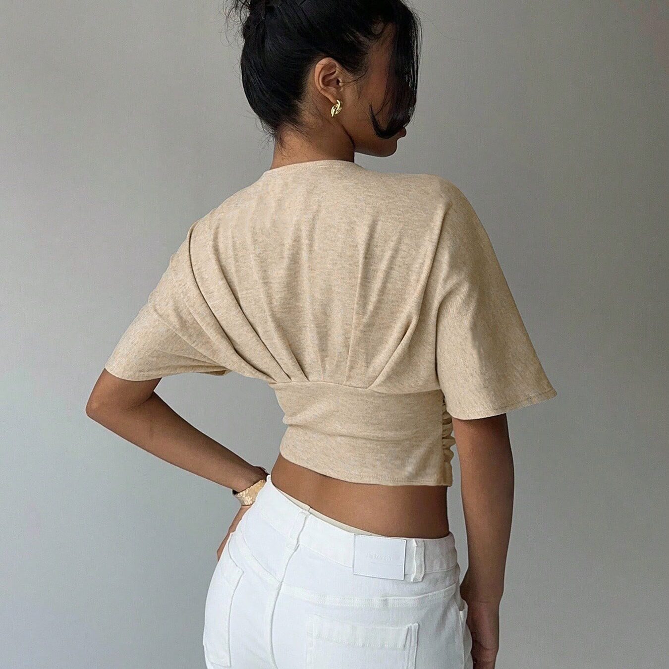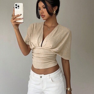 通勤优雅风套头针织蝙蝠袖 女士杏色涤纶 短袖