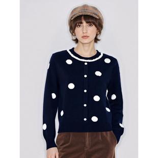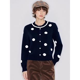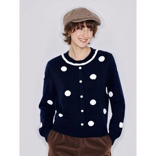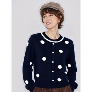 女装 百家好复古藏青色波点针织开衫 秋冬气质毛衣外套 House Basic