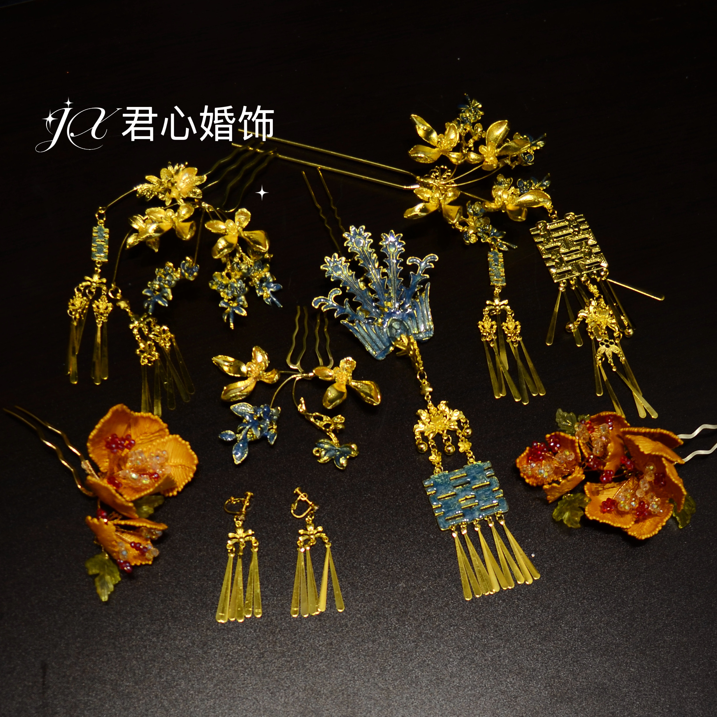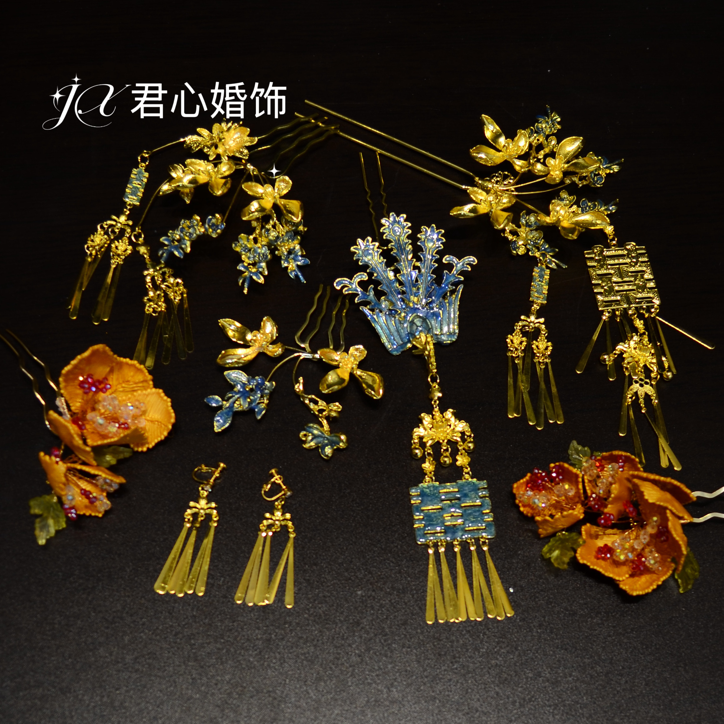君心家 头饰 高级感点翠色橙色花朵囍字凤钗八件套新娘中式