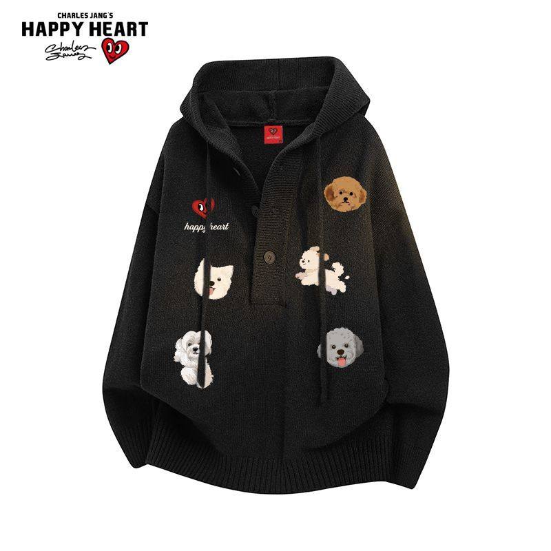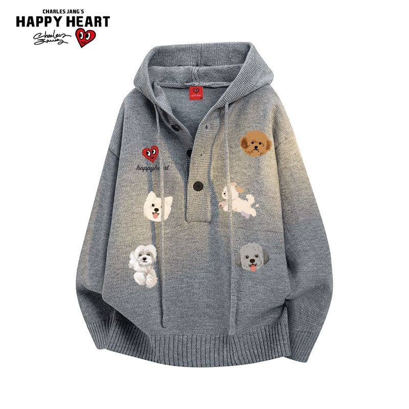 长袖 慵懒情侣针织衫 上衣 新款 查尔斯桃心小狗连帽毛衣外套男女冬季