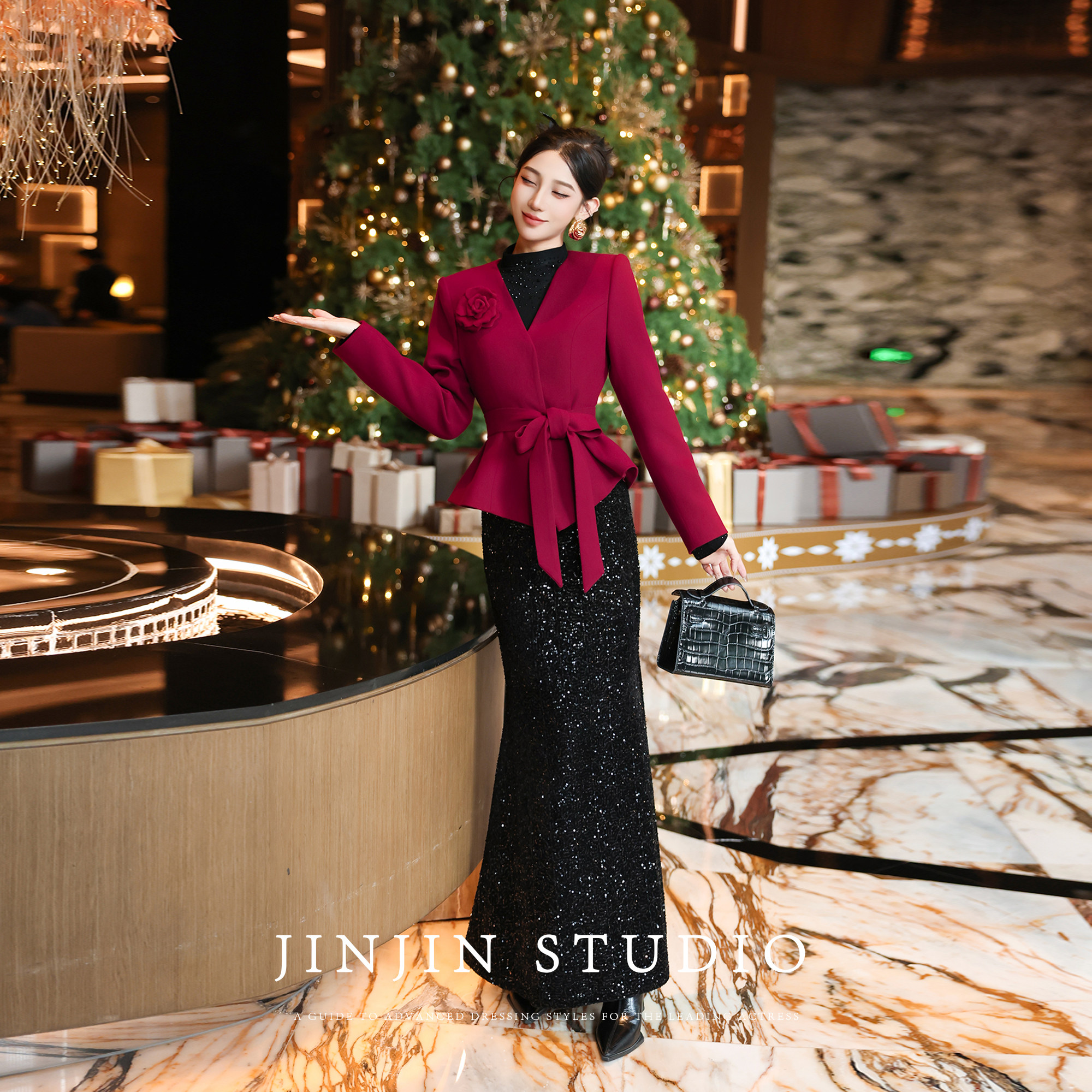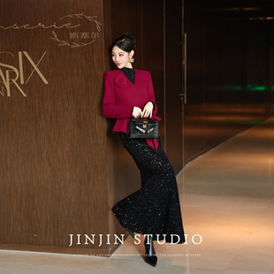 新款 2025冬季 秋水伊人红色翻领毛呢外套 通勤大衣 100%绵羊毛