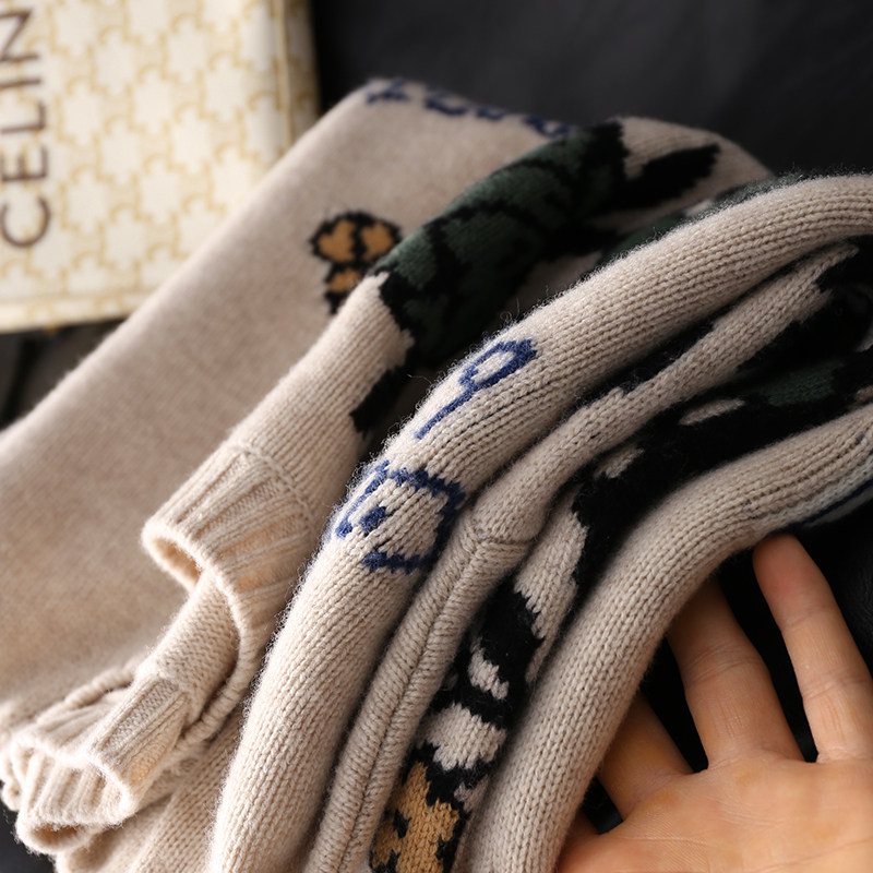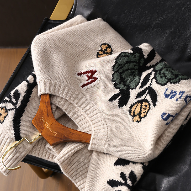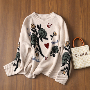 上衣女新 复古花朵提花圆领套头毛衣加厚羊毛针织衫 淘么淘 渠道货