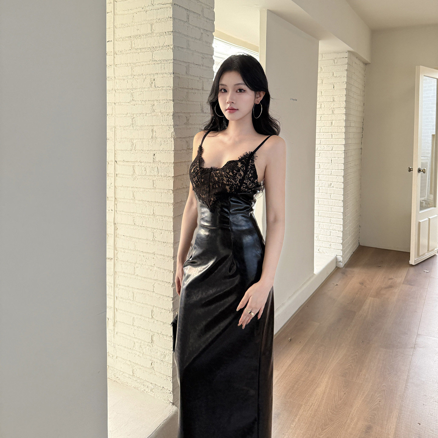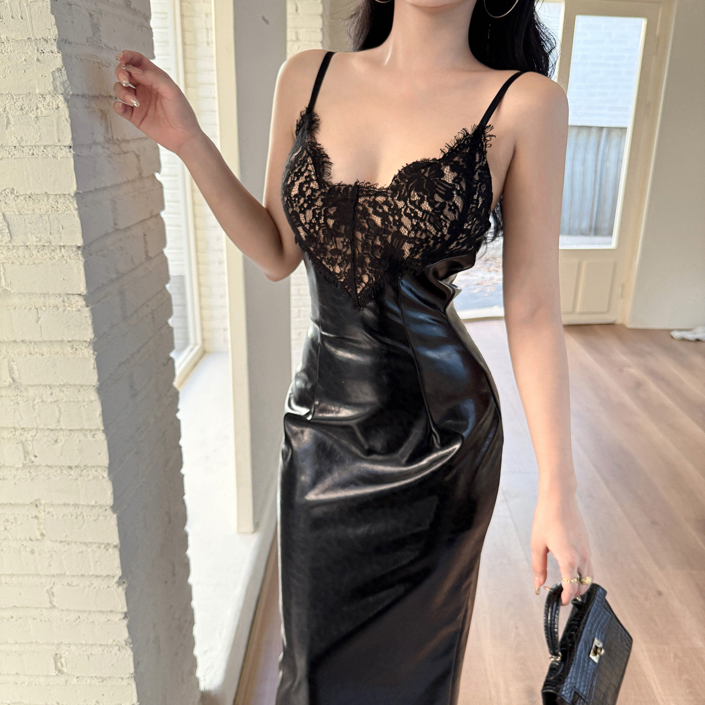 高级感黑色蕾丝拼接吊带连衣裙女2025秋季 性感名媛包臀皮裙子 新款