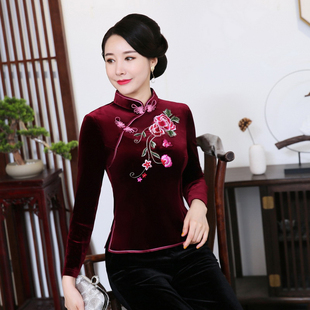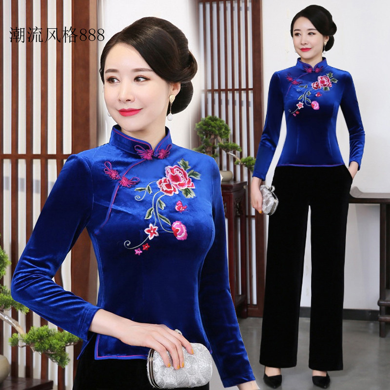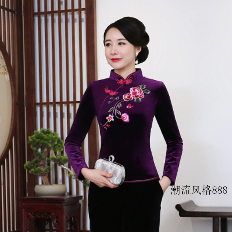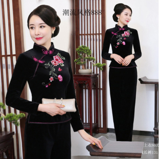 女大码 套装 妈妈婚宴礼服刺绣 丝绒旗袍两件套上衣改良丝绒唐装 长袖