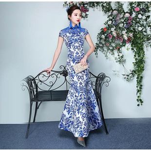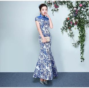 主持宴会晚装 新款 中式 性感修身 演出服女 青花瓷旗袍鱼尾晚礼服长款