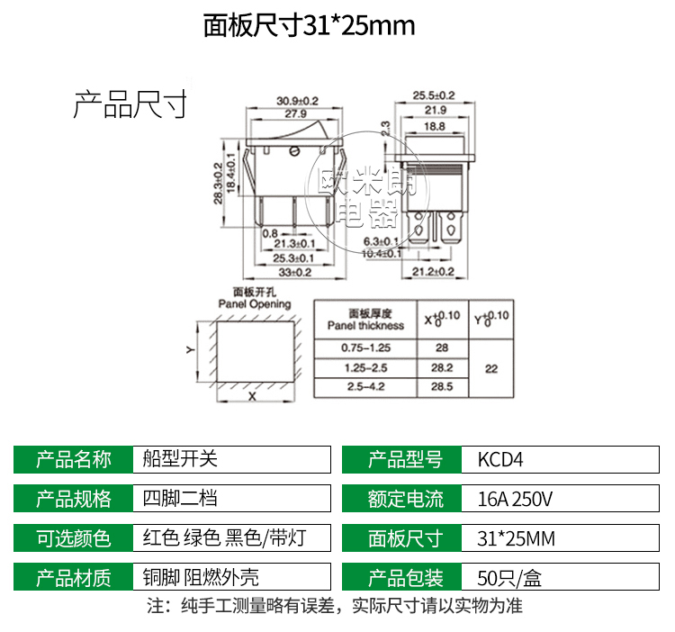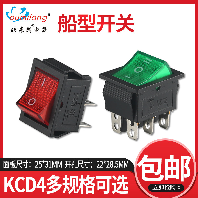 25mm16A250V 绿灯31 KCD4船形开关船型翘板大功率电源按钮4 6脚红