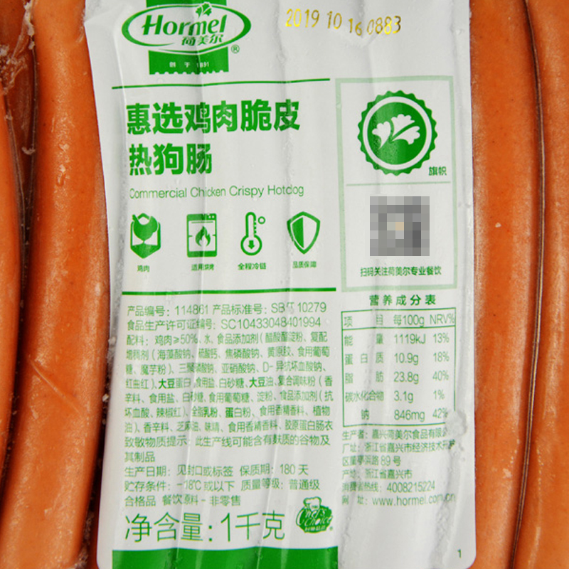 荷美尔法兰克福脆皮肠1kg 烧烤香肠西餐披萨肠早餐鸡肉热狗肠烘焙