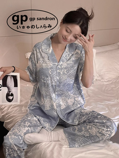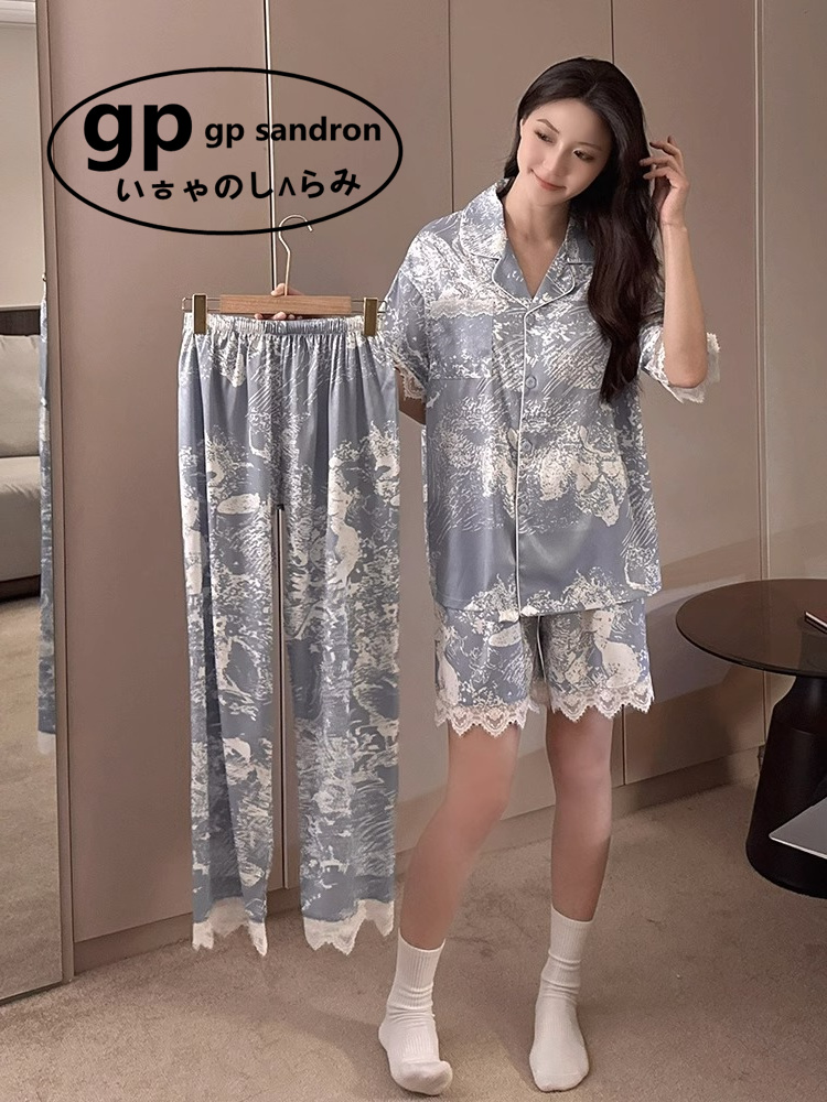 日本小众gp冰丝绸睡衣女夏季 高级感水墨画家居服可外穿三件套 短袖