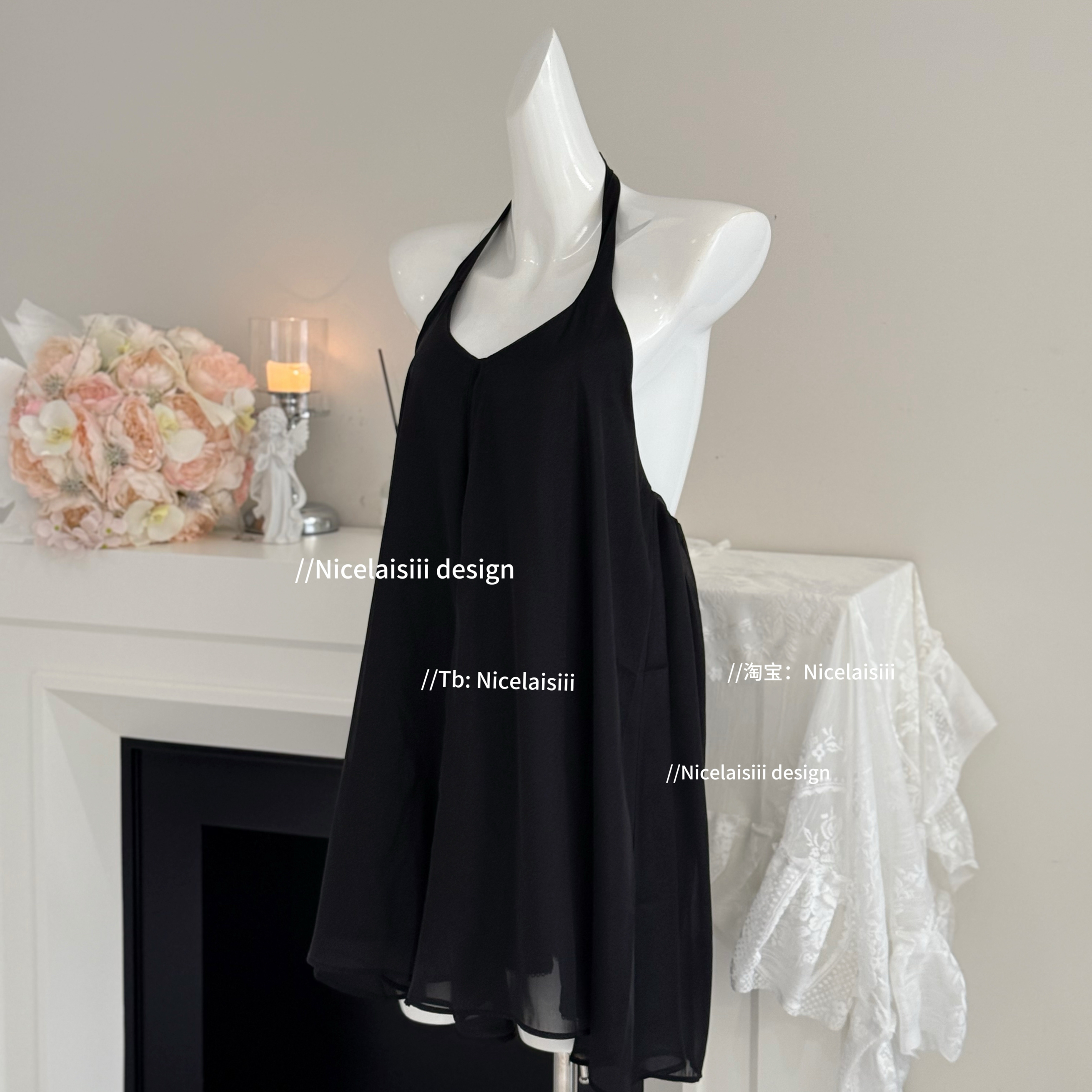 Nicelaisiii浪漫出逃 纯欲风露背吊带睡裙性感睡衣女 甜美挂脖法式