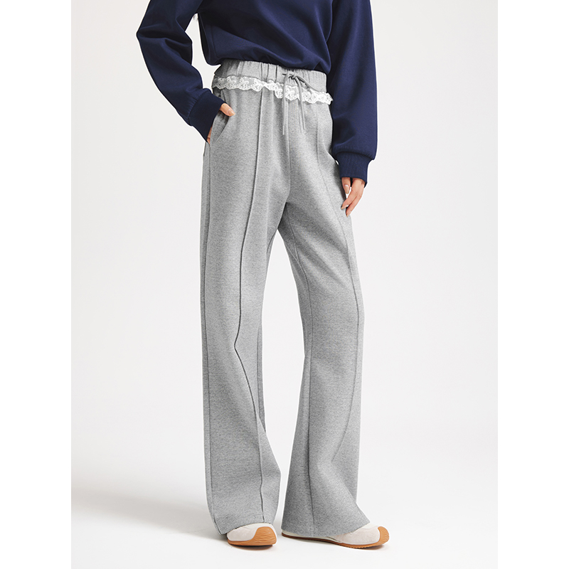 MOCO休闲裤 软糯风 含绵羊毛抽绳松紧高腰立体中线长直筒宽松运动裤