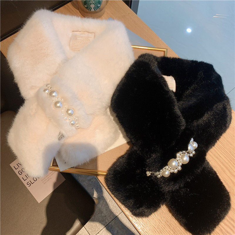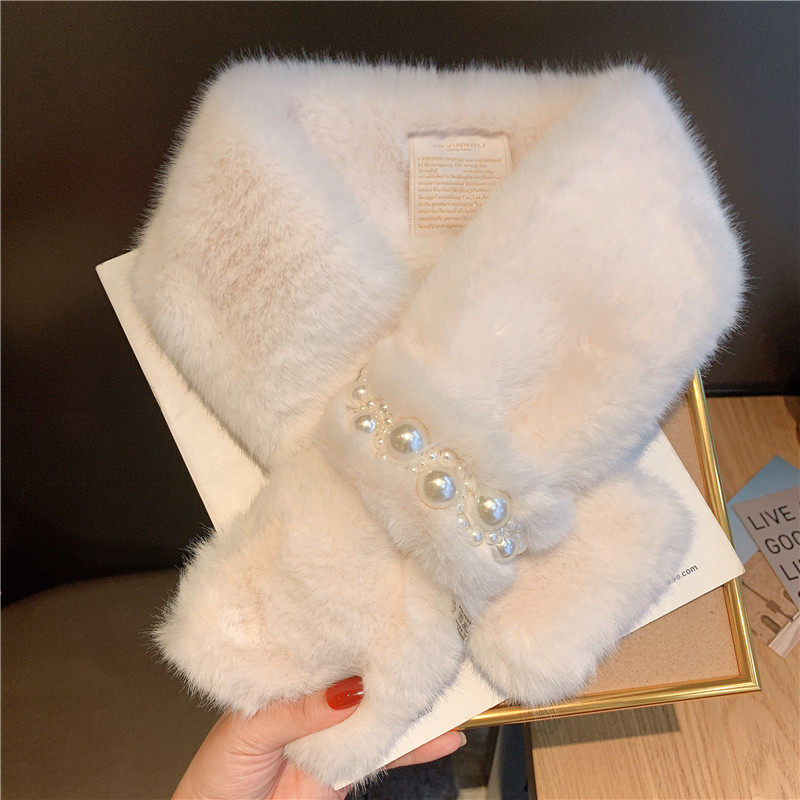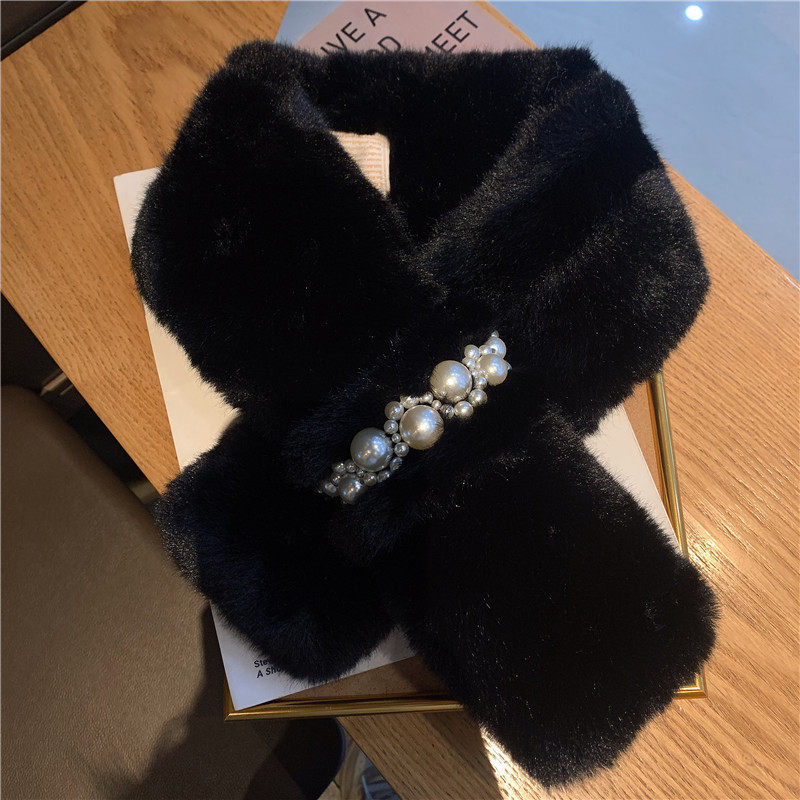 珍珠毛毛围巾女冬季 保暖秋冬仿兔毛围脖交叉毛领 ins学生百搭韩版