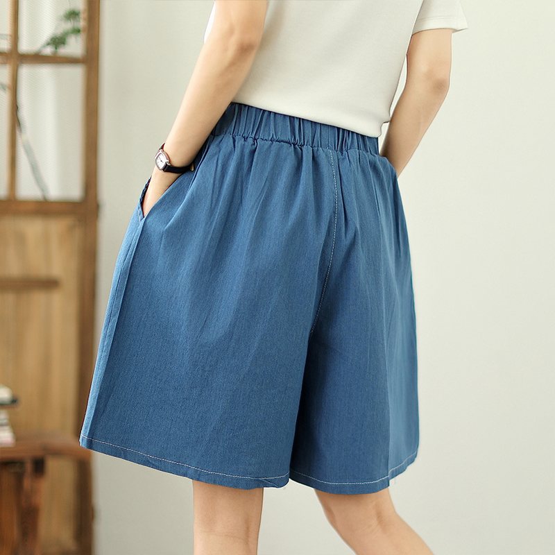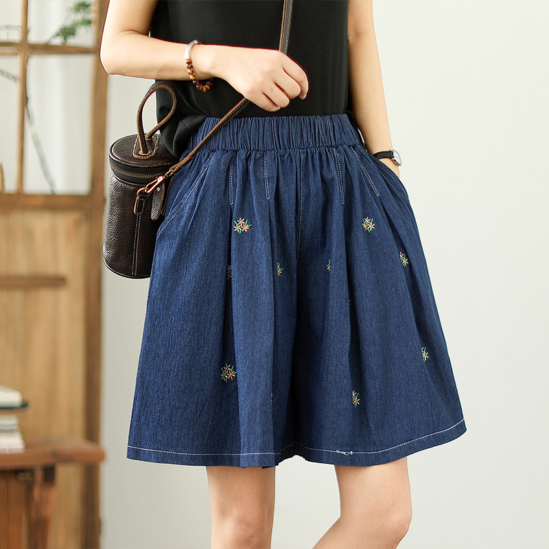 韩国刺绣宽松裙裤 裙休闲阔腿五分裤 松紧腰牛仔绣花短裤 文艺大码