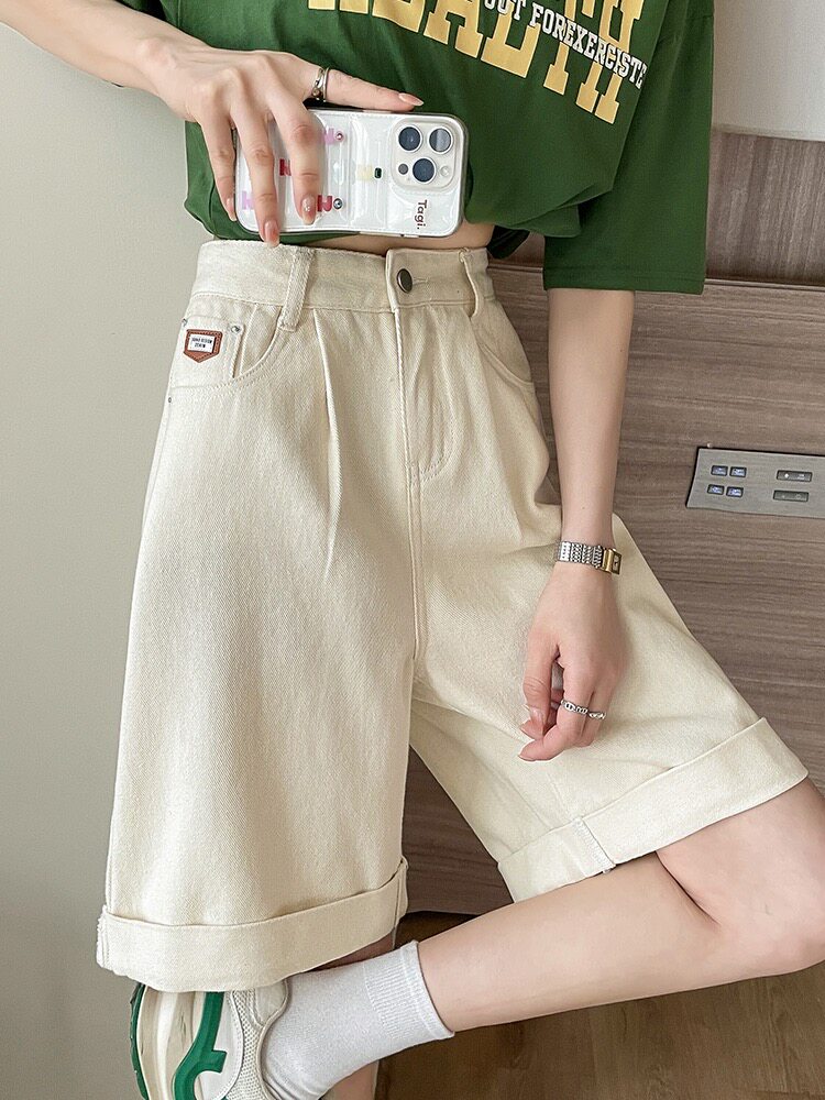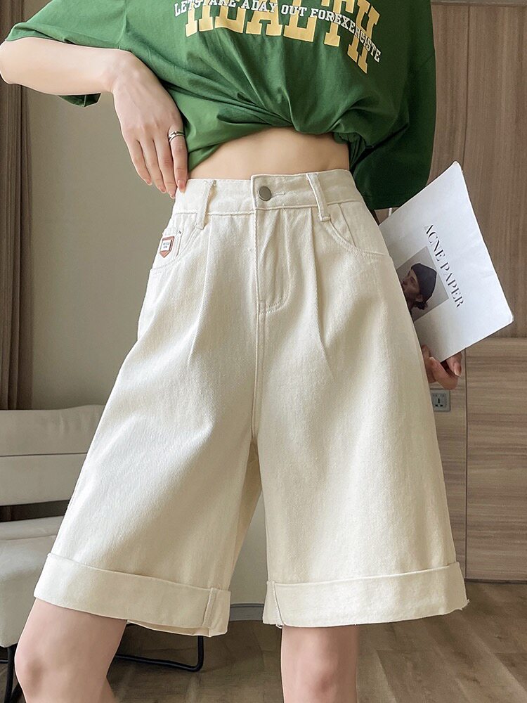 宽松阔腿卷边2026白色短裤 牛仔中裤 梨形身材马裤 女秋冬春季 五分裤