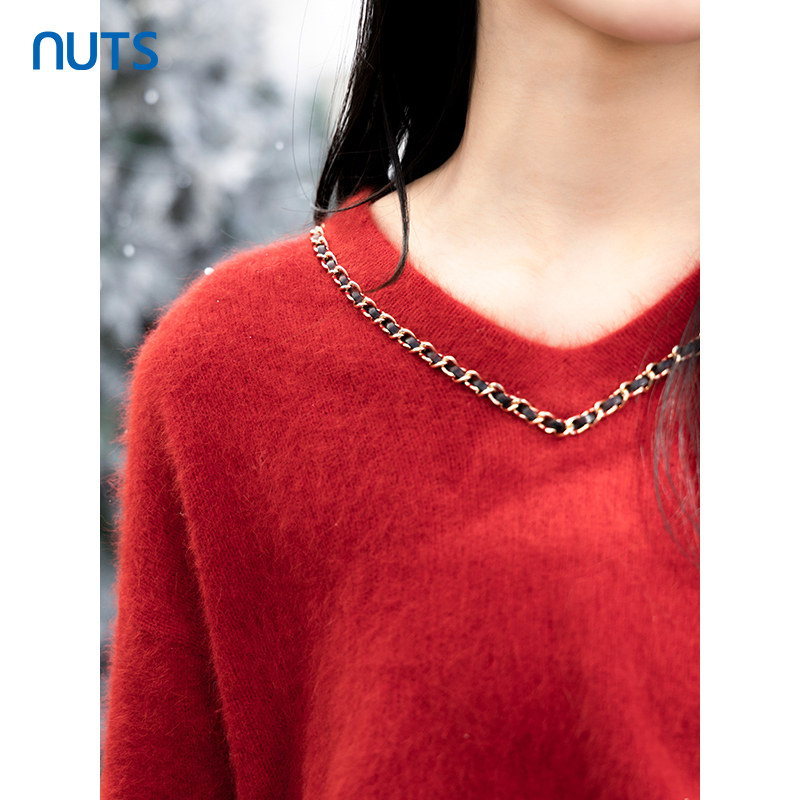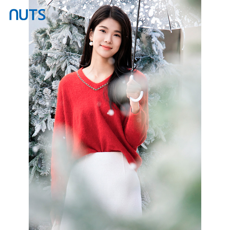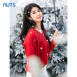 1199 女4450509A1 NUTS冬季 红色高级感气质宽松V领毛衣毛织套头衫