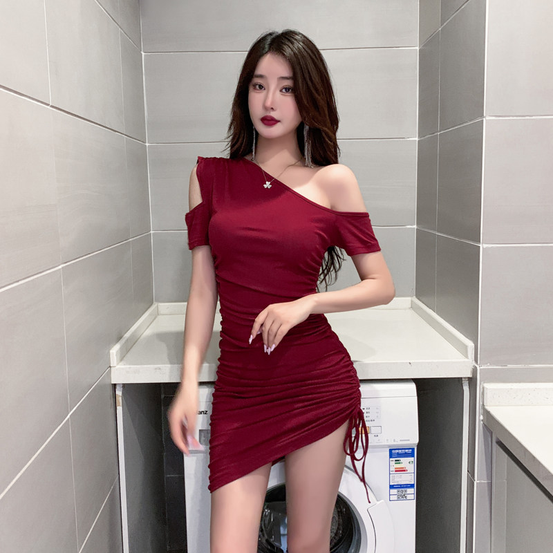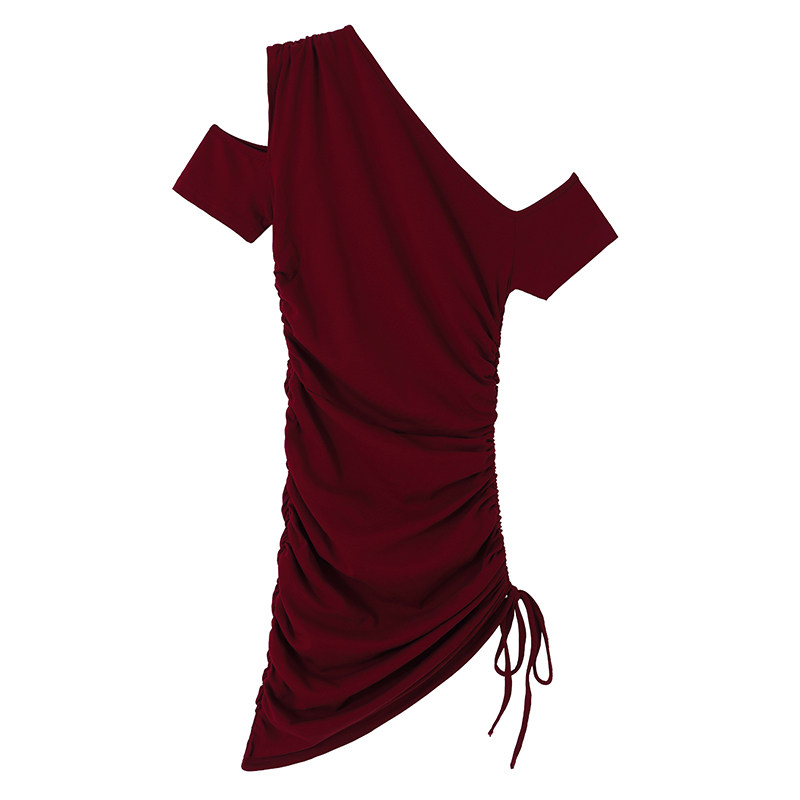 斜肩露肩连衣裙抽绳小众设计感性感女装 包臀裙子 辣妹收腰显瘦修身