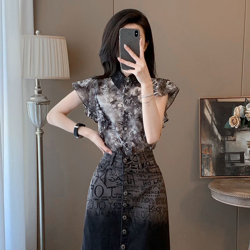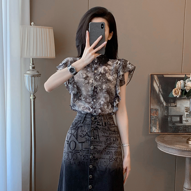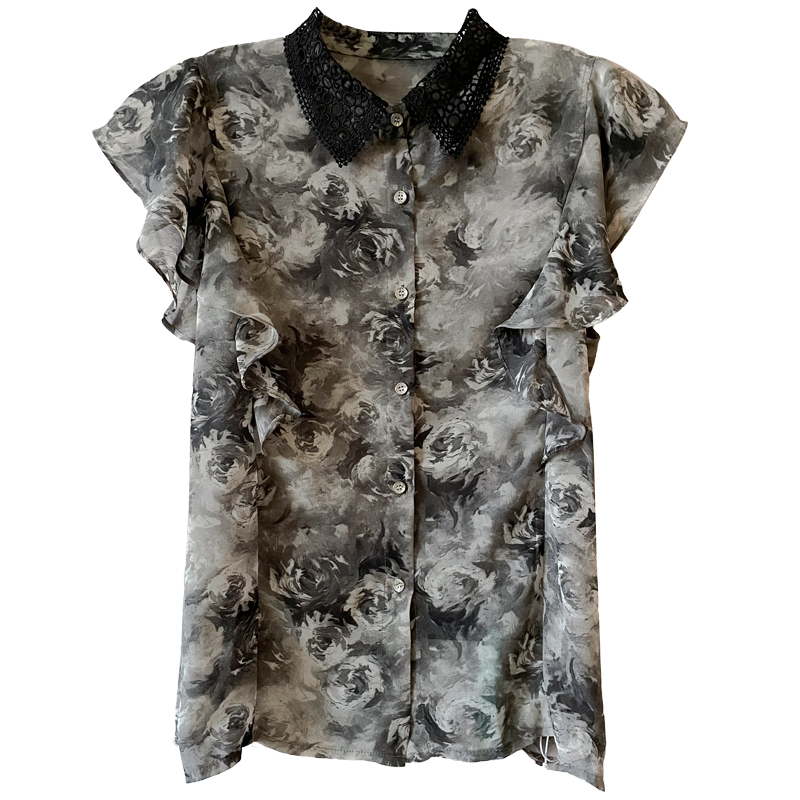 新款 女夏季 宽松设计感小众撞色衬衣上衣 雪纺衬衫 复古碎花蕾丝短袖