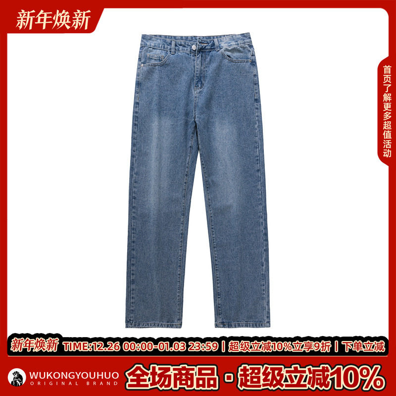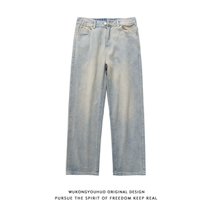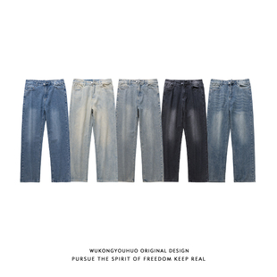悟空有货潮牌复古做旧水洗直筒牛仔裤 男街头宽松百搭阔腿休闲长裤