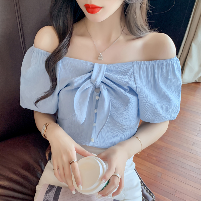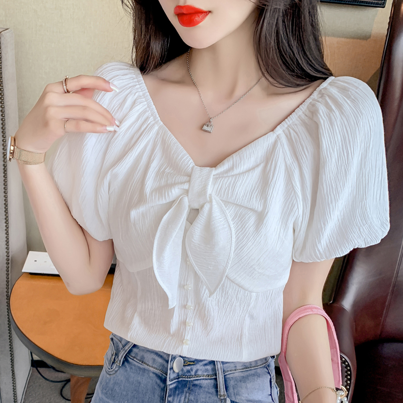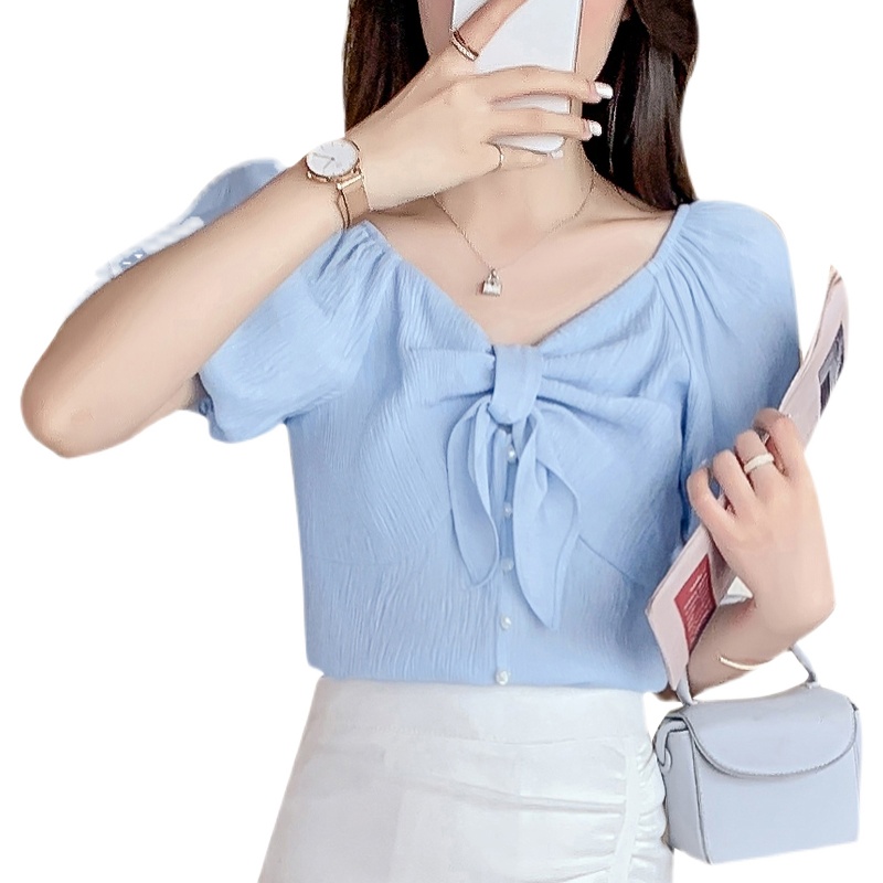 衬衫 小衫 上衣女夏季 设计感小众蝴蝶结别致短袖 新款 洋气雪纺泡泡袖