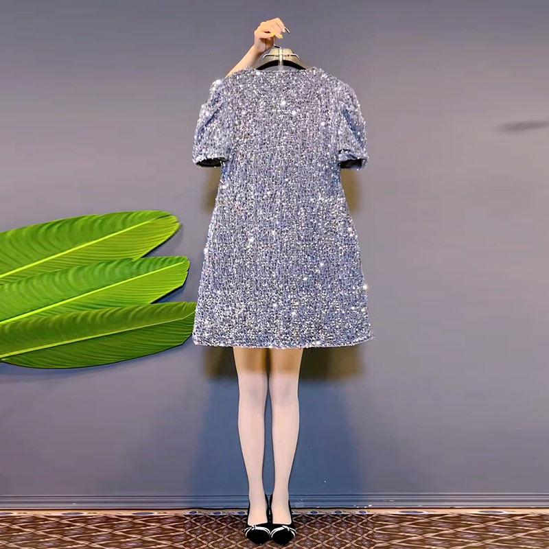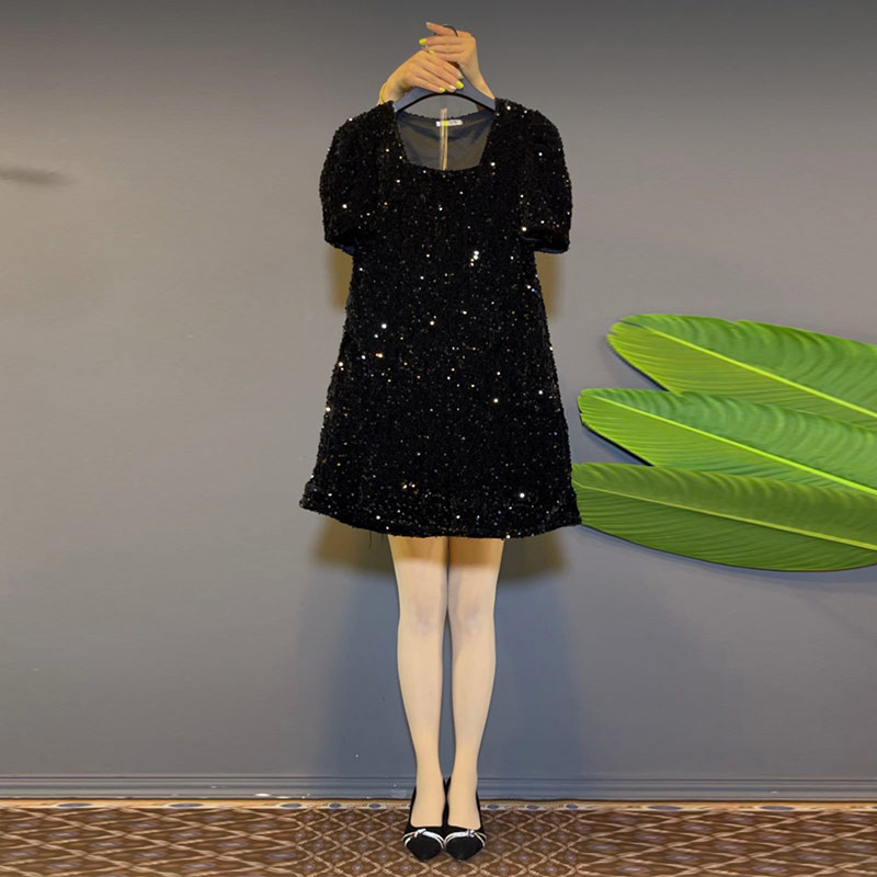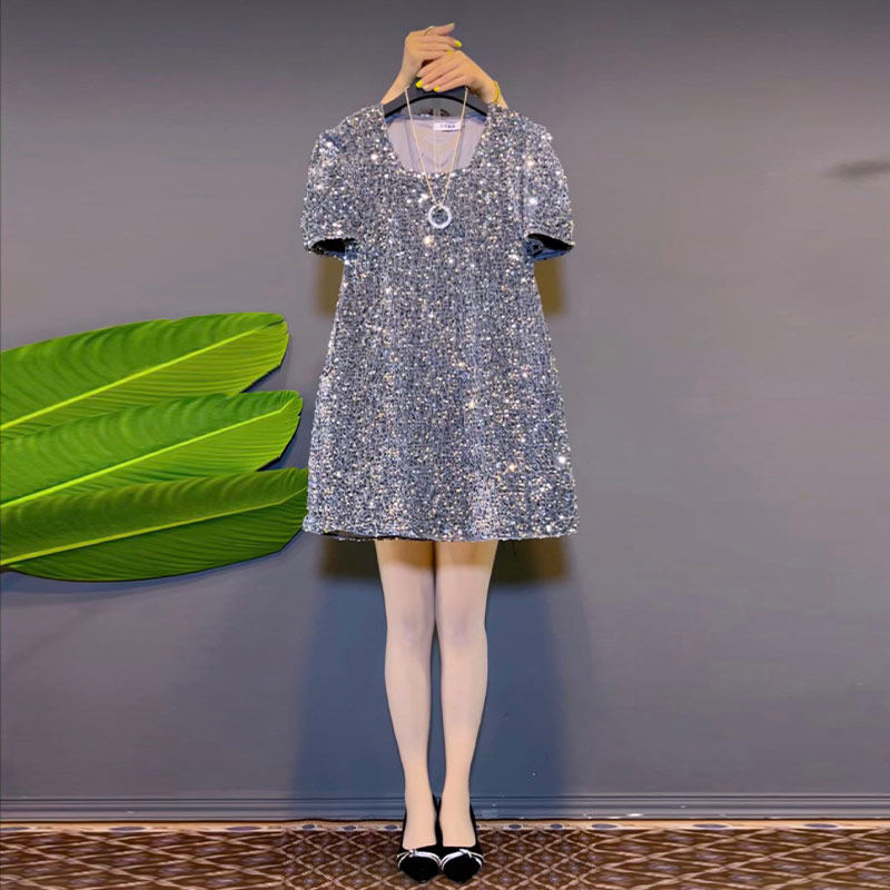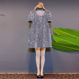 短袖 大码 2026新款 欧洲站性感中长款 裙子胖妹妹方领亮片连衣裙 女装