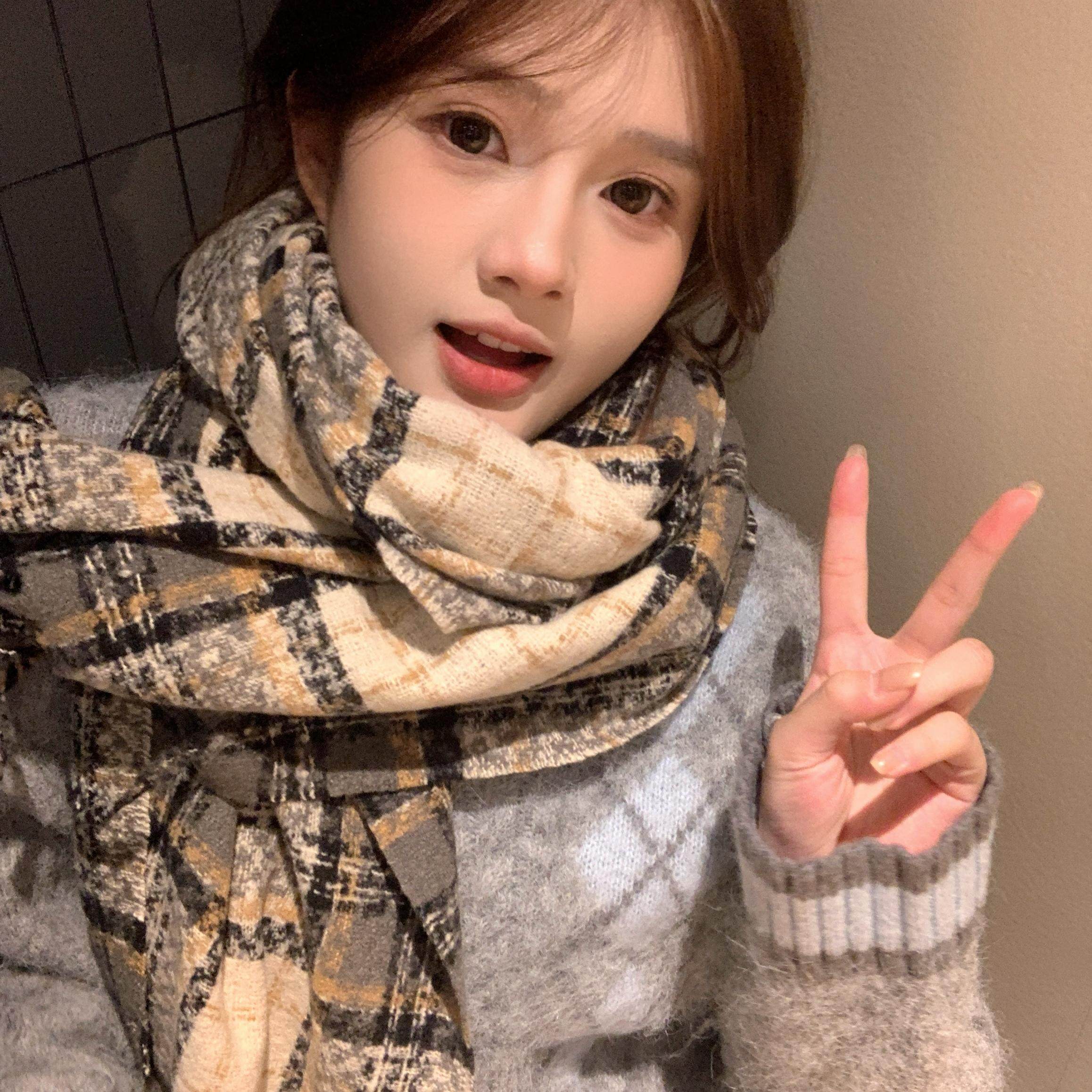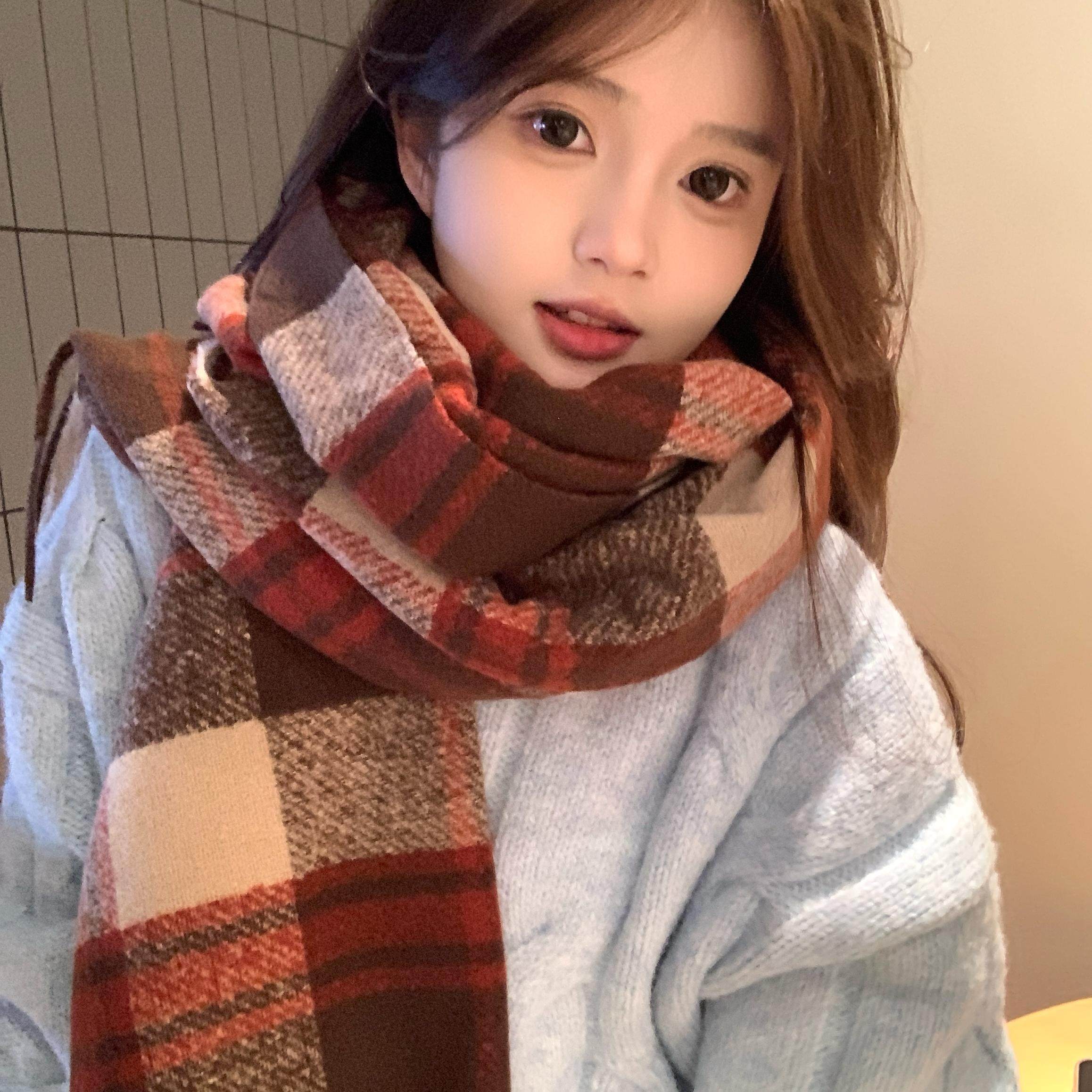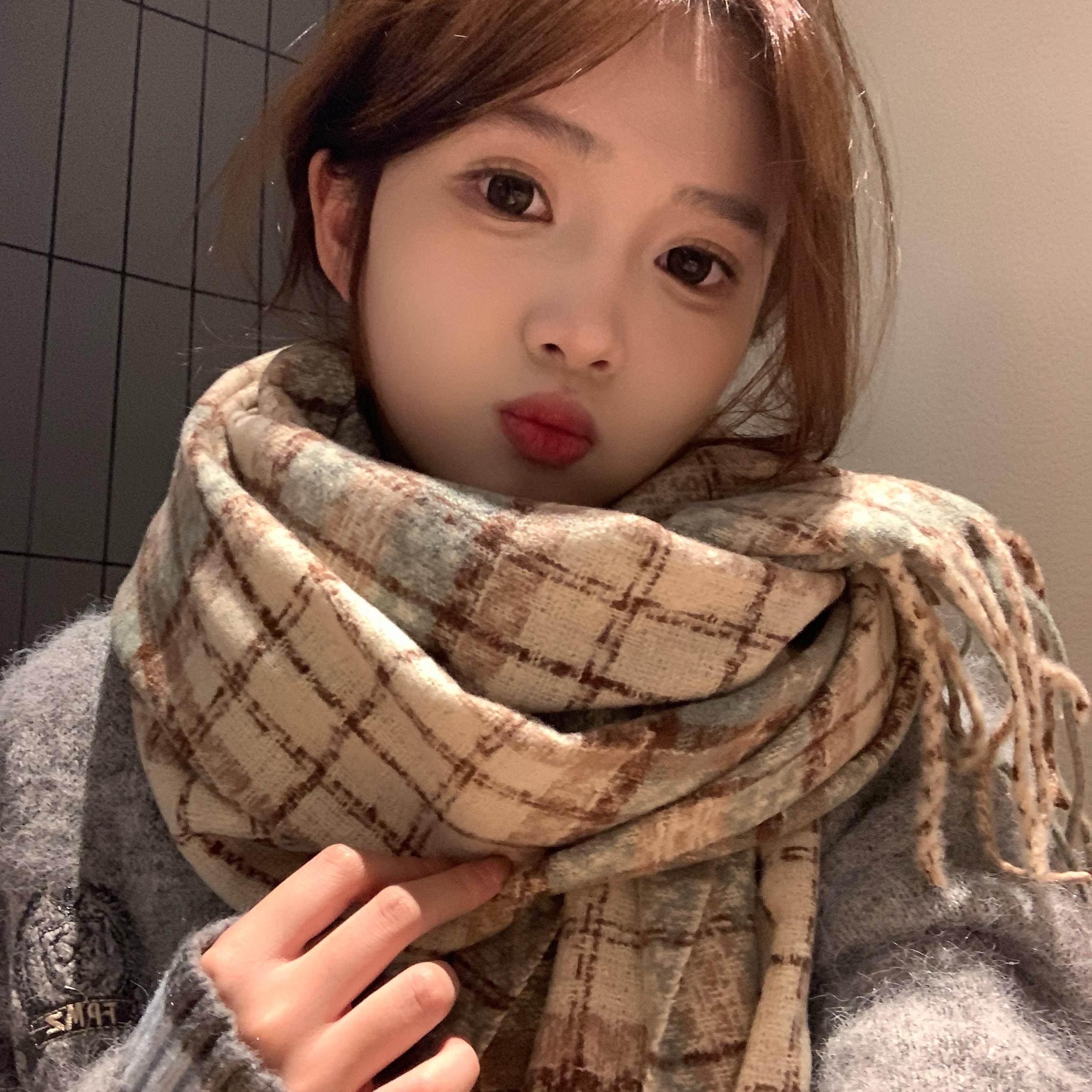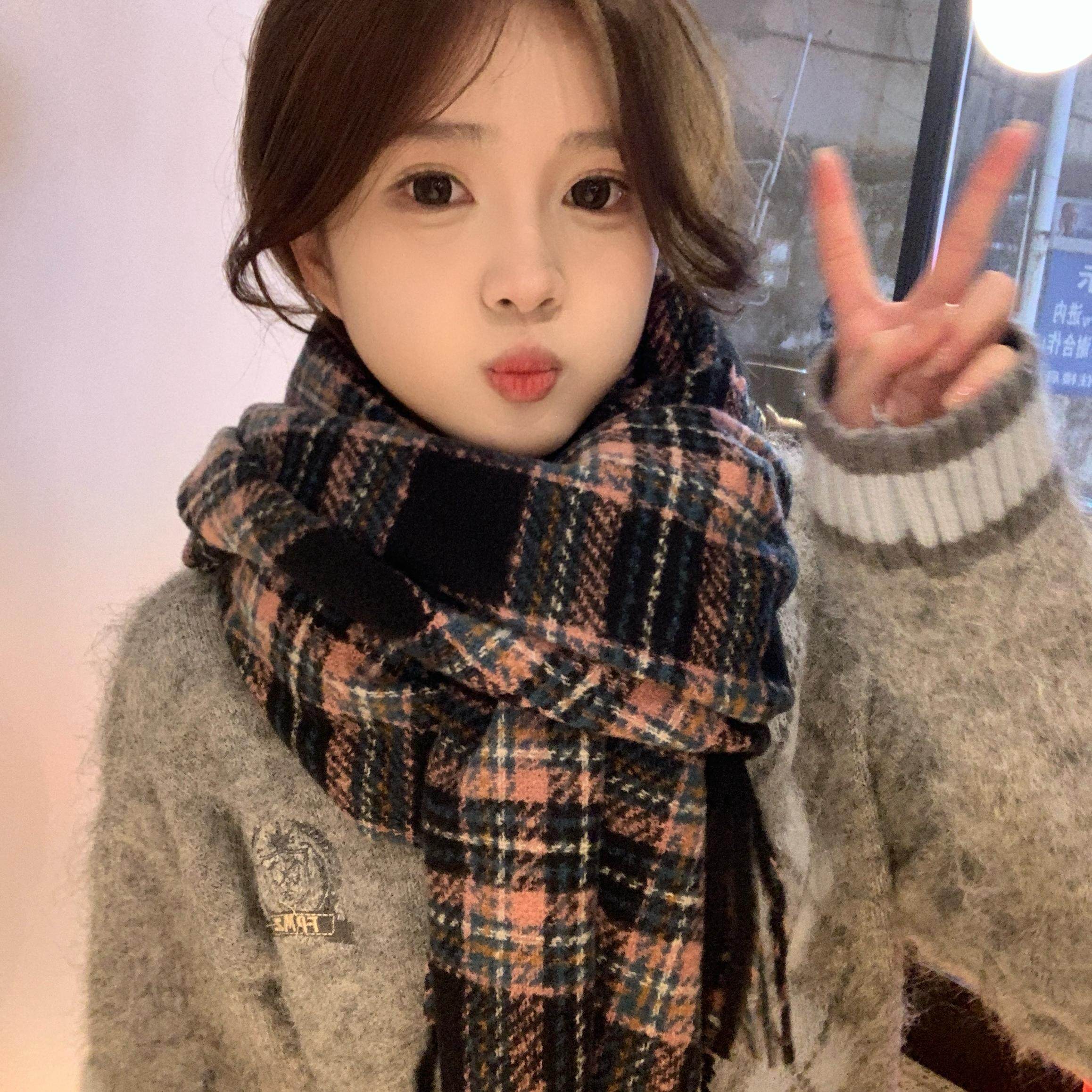 新款 氛围高级秋冬百搭显白流苏披肩保暖围脖 粉色格子学生围巾冬季
