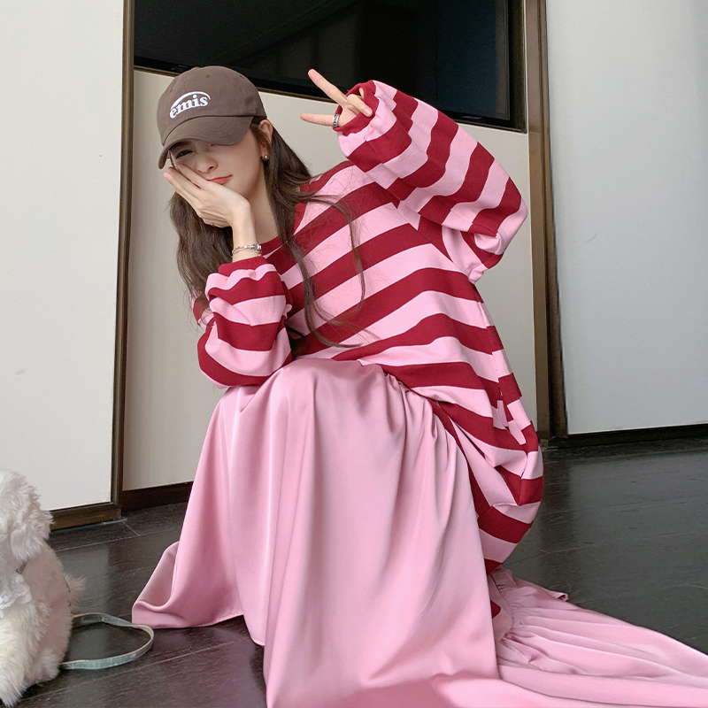 孕妇粉色条纹拼接卫衣裙女中长款 复古宽松学院风连衣裙 2024秋新款