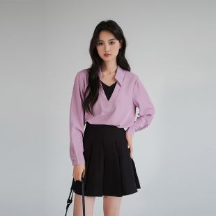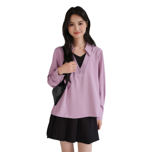 胖mm春装 气质V领假两件衬衫 别致休闲上衣 女装 蓝若水大码
