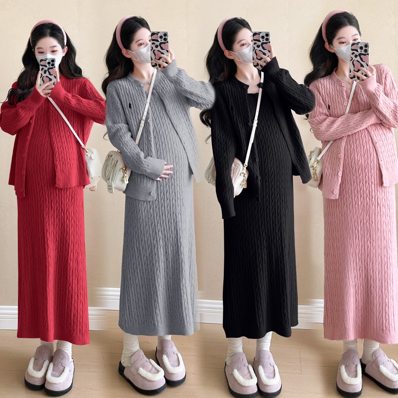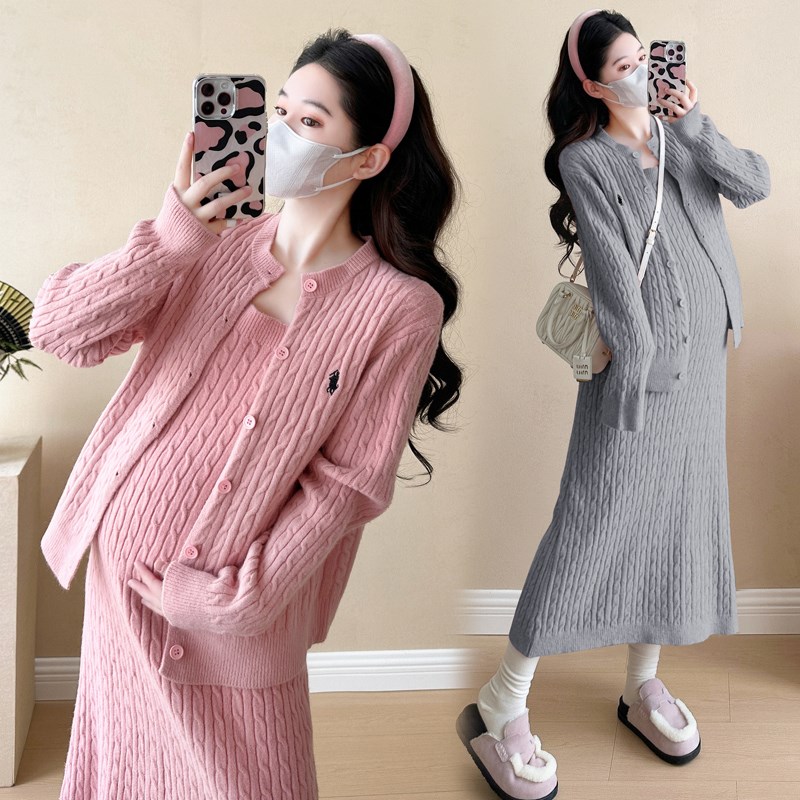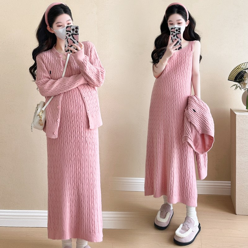 时尚 2024秋冬新款 韩版 网红u毛衣裙套装 外套针织吊带裙两件 孕妇装