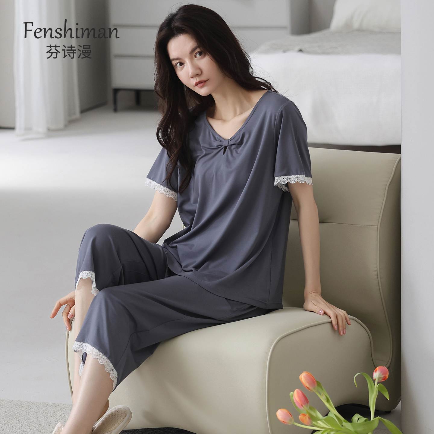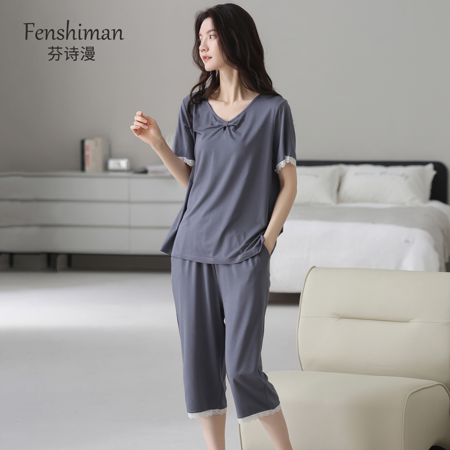 莫代尔2025新款 睡衣女款 七分裤 带胸垫短袖 夏天冰丝妈妈家居服 夏季
