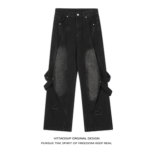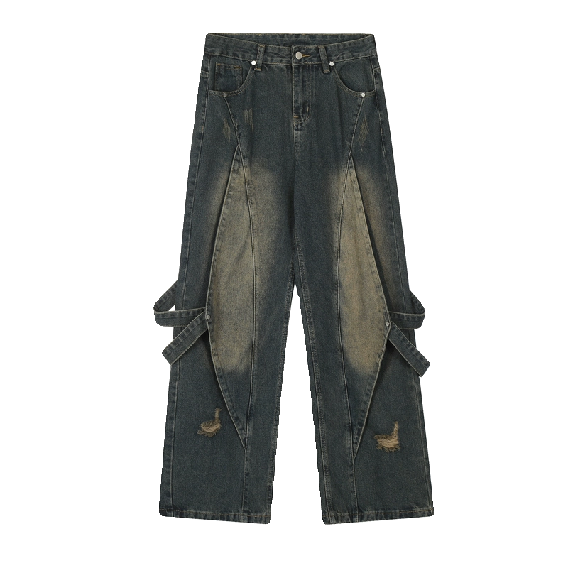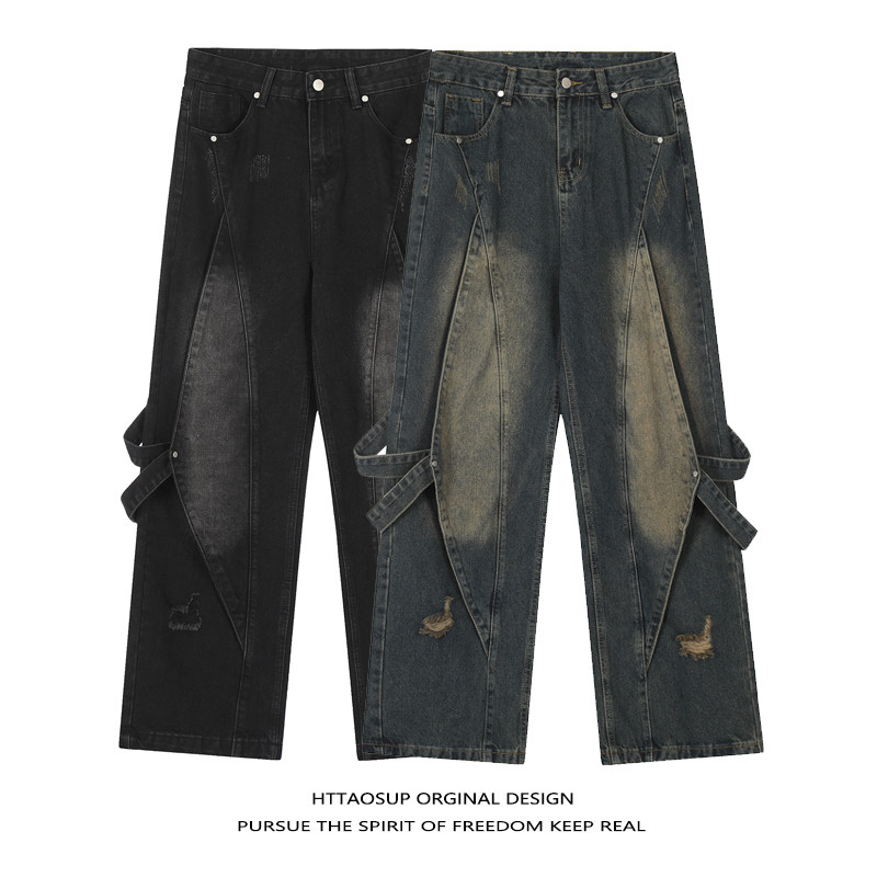女小众设计阔腿裤 哟酷酷 复古结构搭片设计牛仔裤 美式 牛仔部落