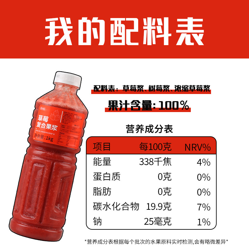 达川草莓复合果浆 芝芝莓莓鲜榨草莓汁非浓缩nfc果汁奶茶店专用