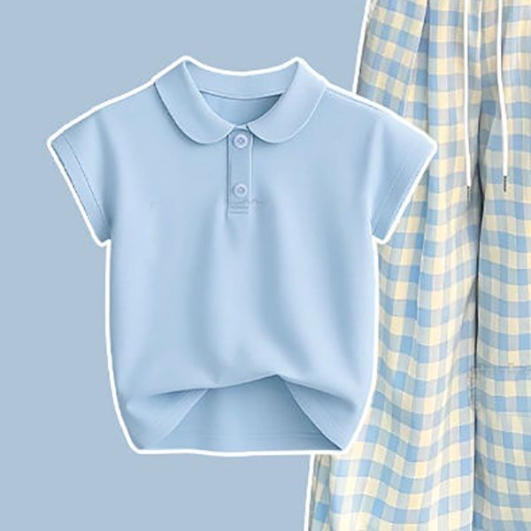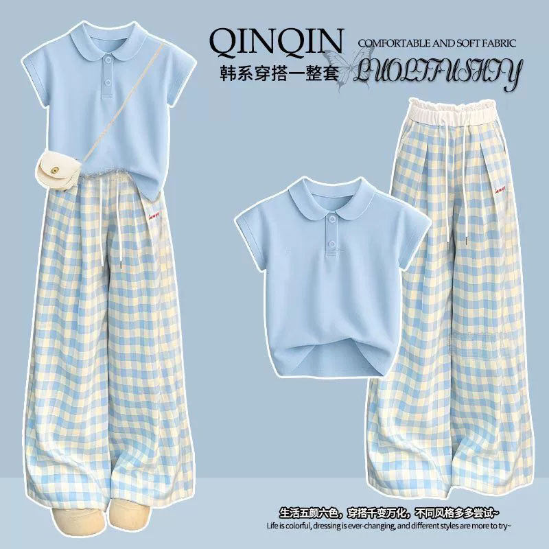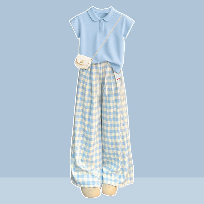 2025青少年学院Polo领T恤蓝色休闲两件套 套装 大童夏季 阔腿格子裤