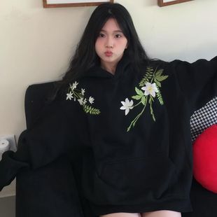 V37美式 加绒加厚休闲情侣上衣 重磅廓形字母刺绣连帽卫衣男秋冬季