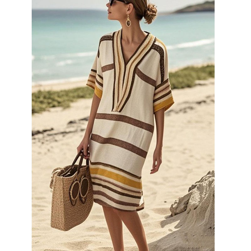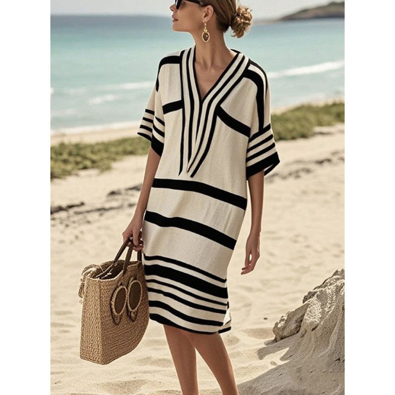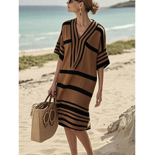 欧美亚马逊独立站数码 连衣裙Dress 印花条纹V领宽松波西米亚中袖