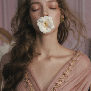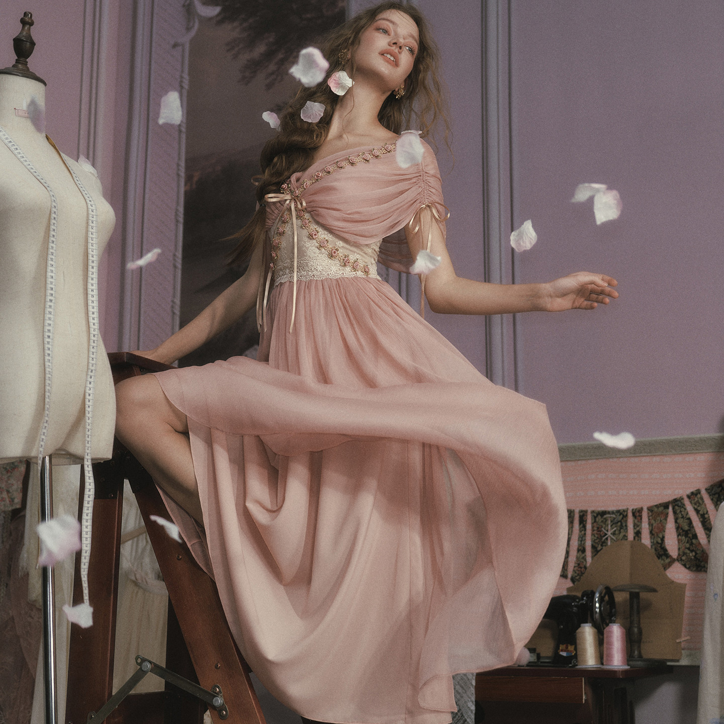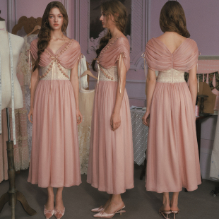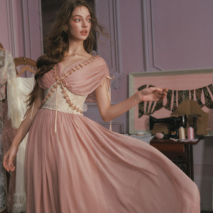 复古设计感长裙粉色仙女裙收腰连衣裙女 法式 LaceMade 玫瑰橄榄枝