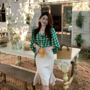 百搭V领长袖 Echoone 高级别致格纹绑带气质时尚 pomelo 上衣 Green