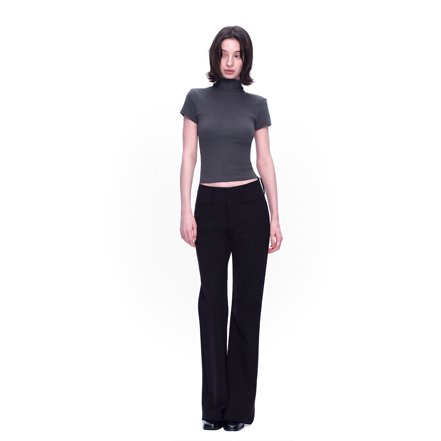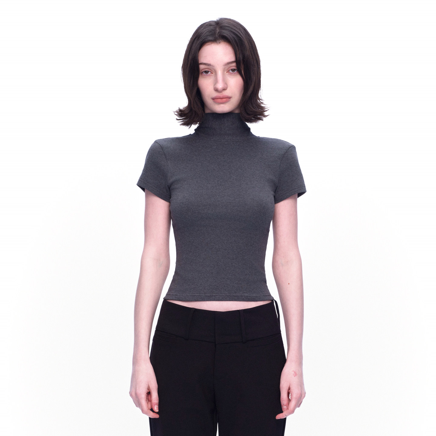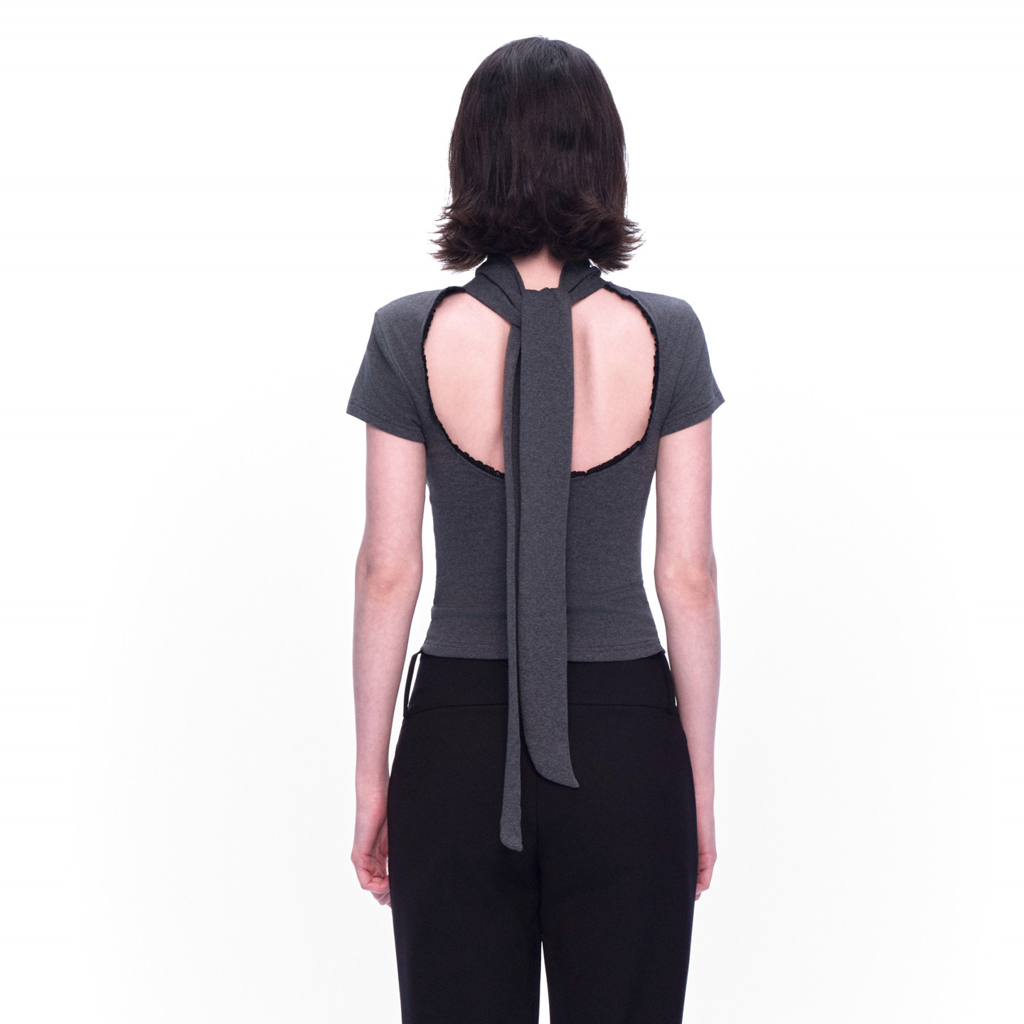 弹力修身 深灰色正肩T恤小高领飘带露背短袖 T恤 PAGE EMPTY
