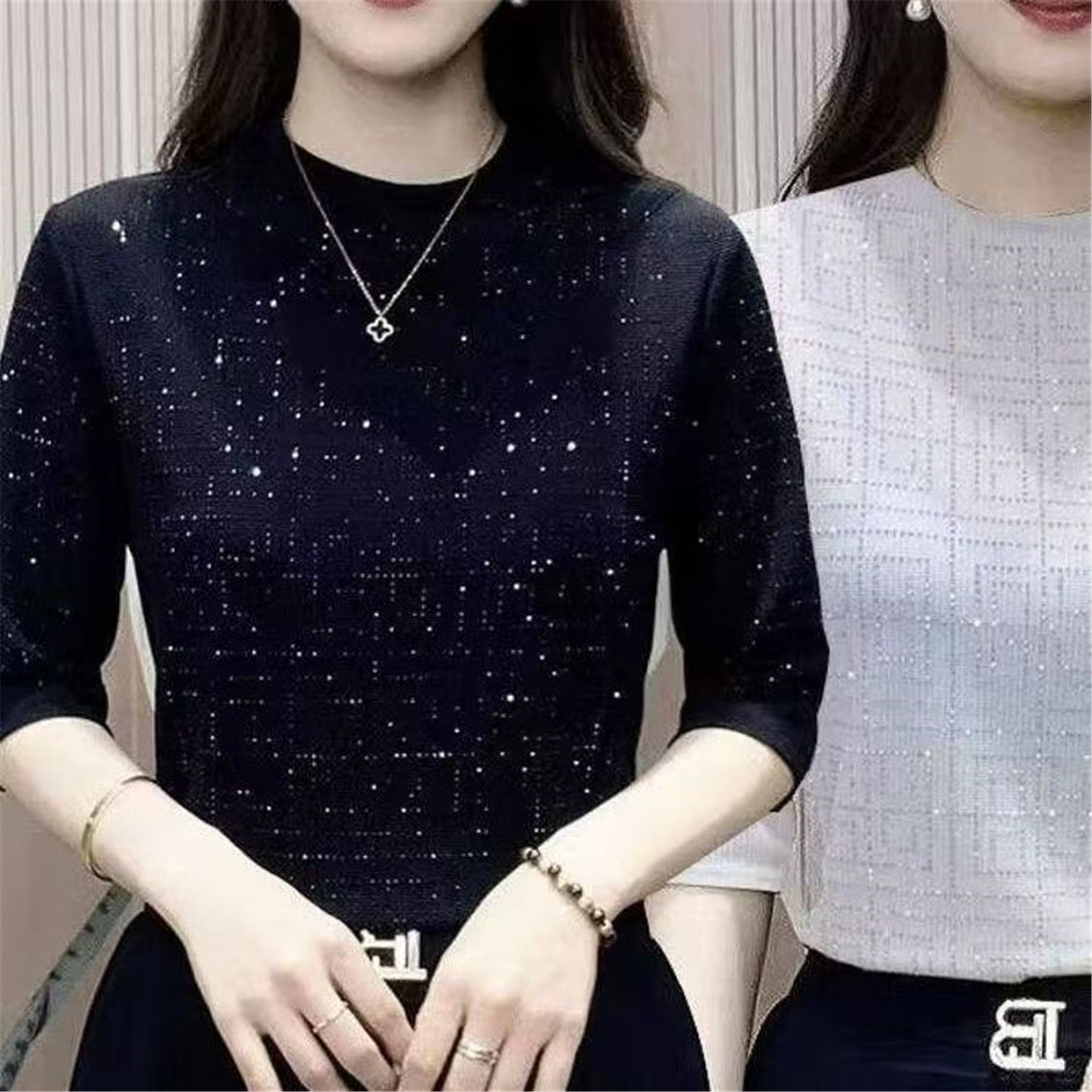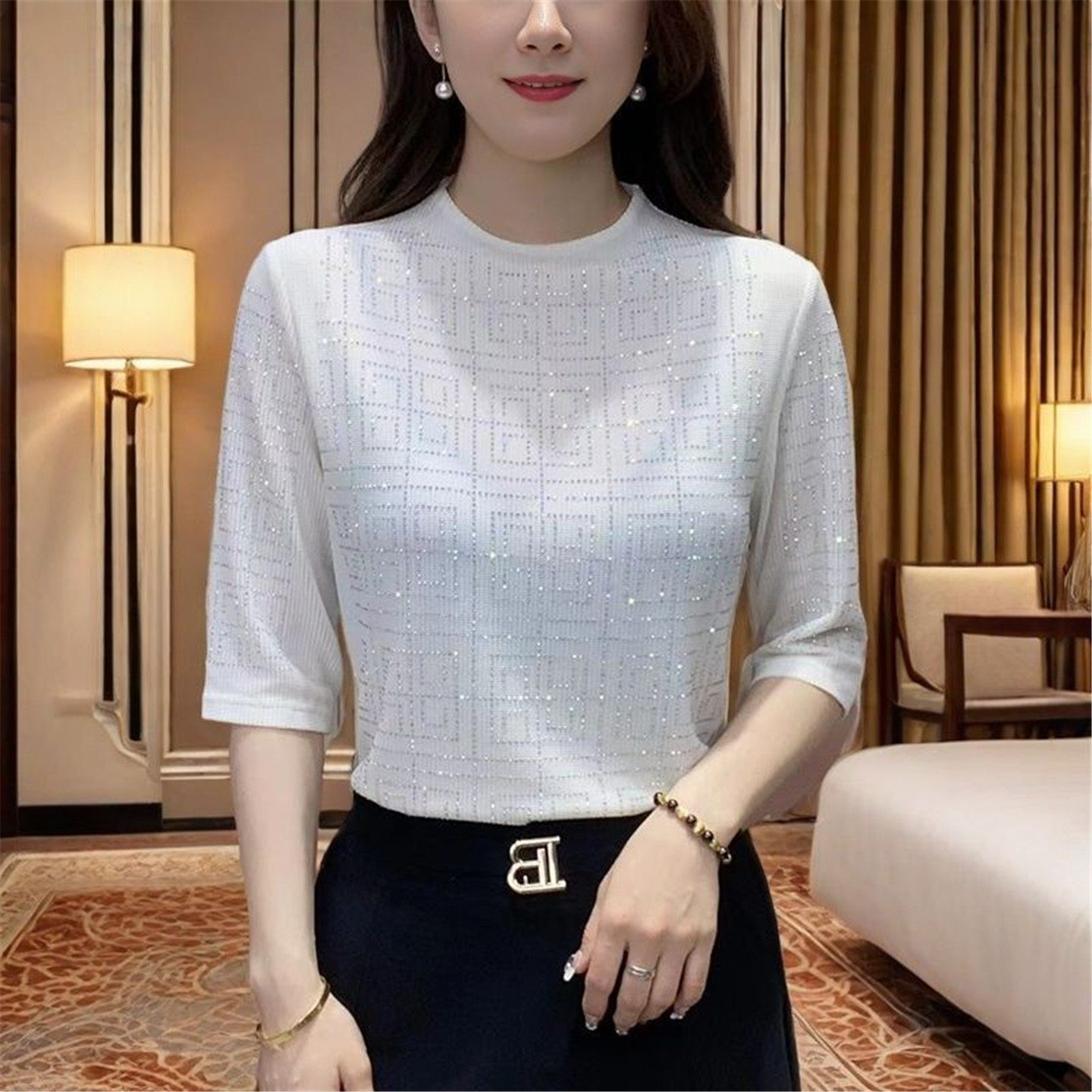 五分袖 镂空亮片休闲上衣打底衫 圆领t恤女妈妈装 大码 夏季 冰丝薄款