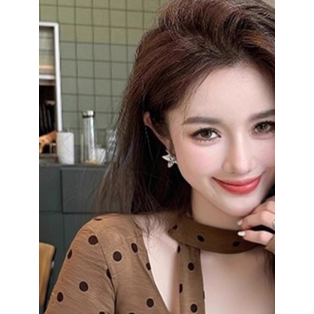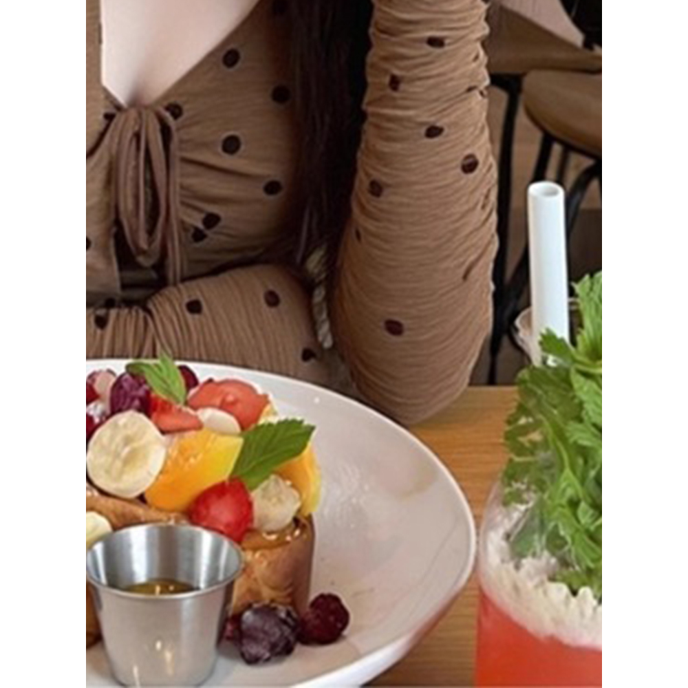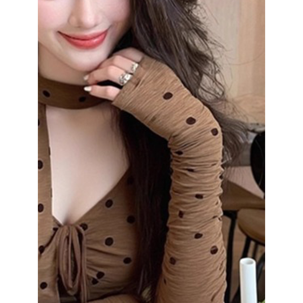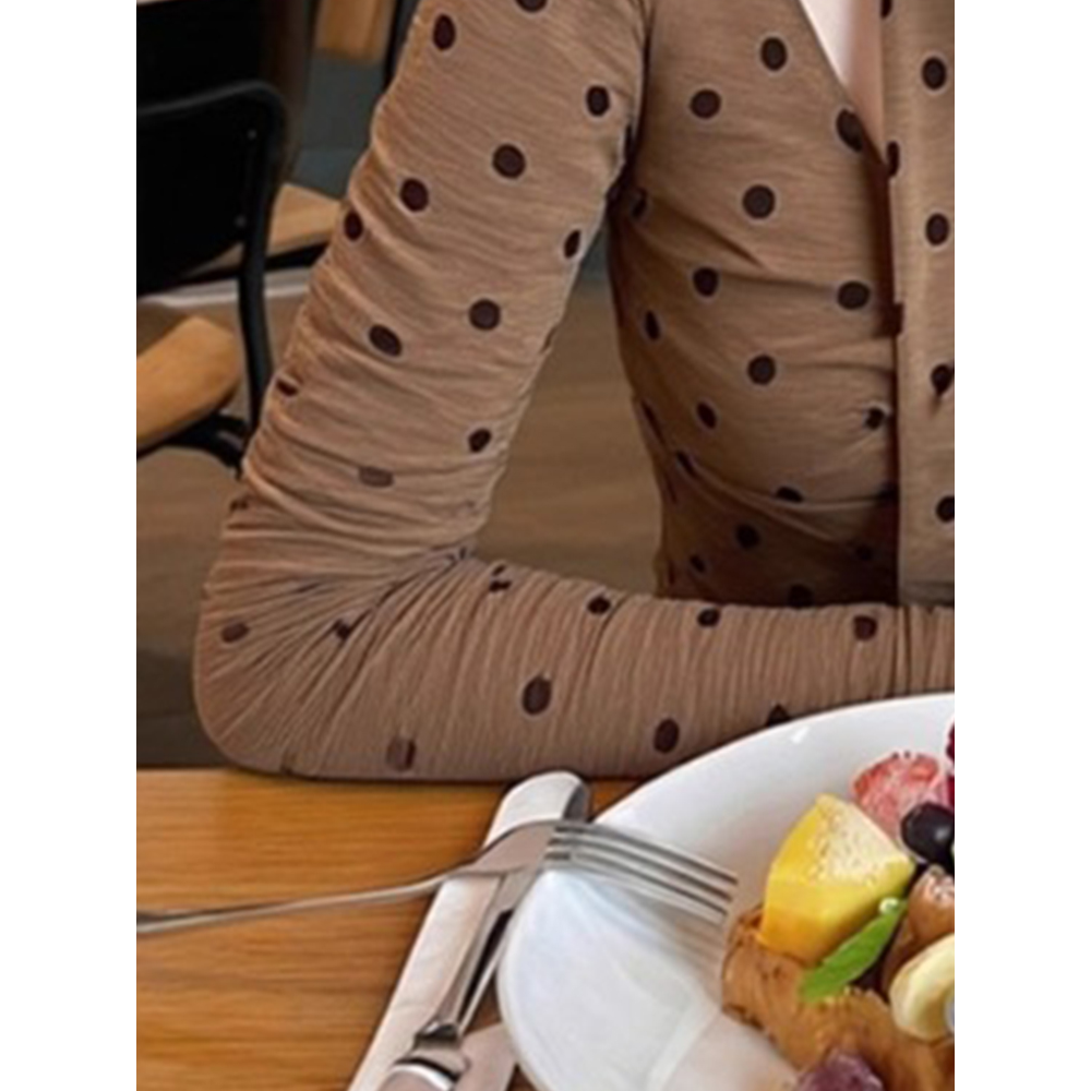 t恤上衣 显瘦长袖 秋冬复古咖色波点v领打底衫 女内搭设计感辣妹修身