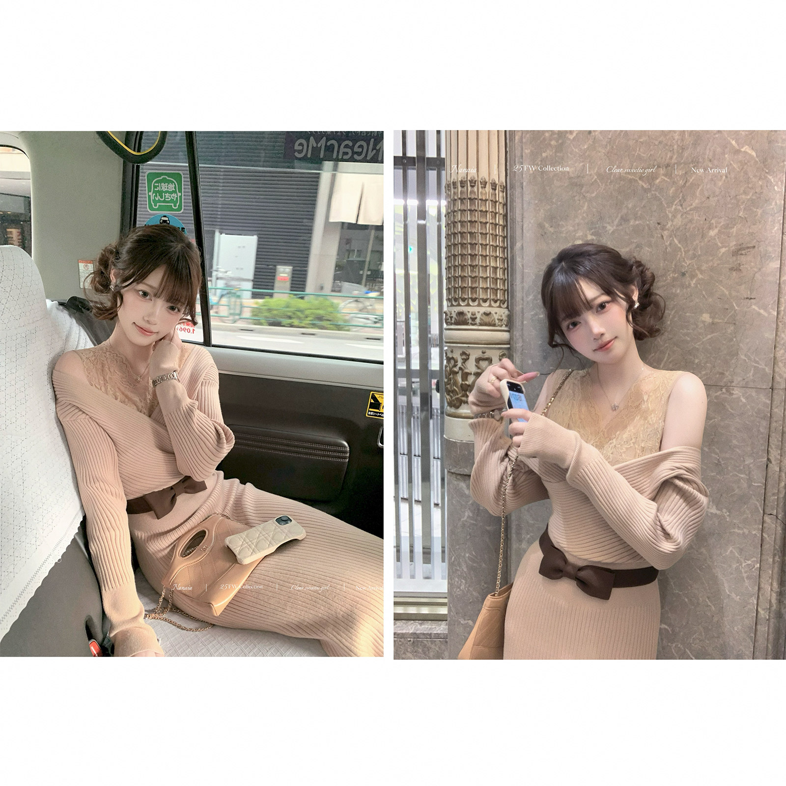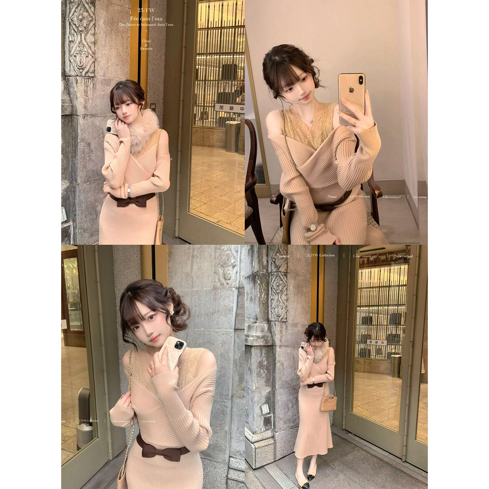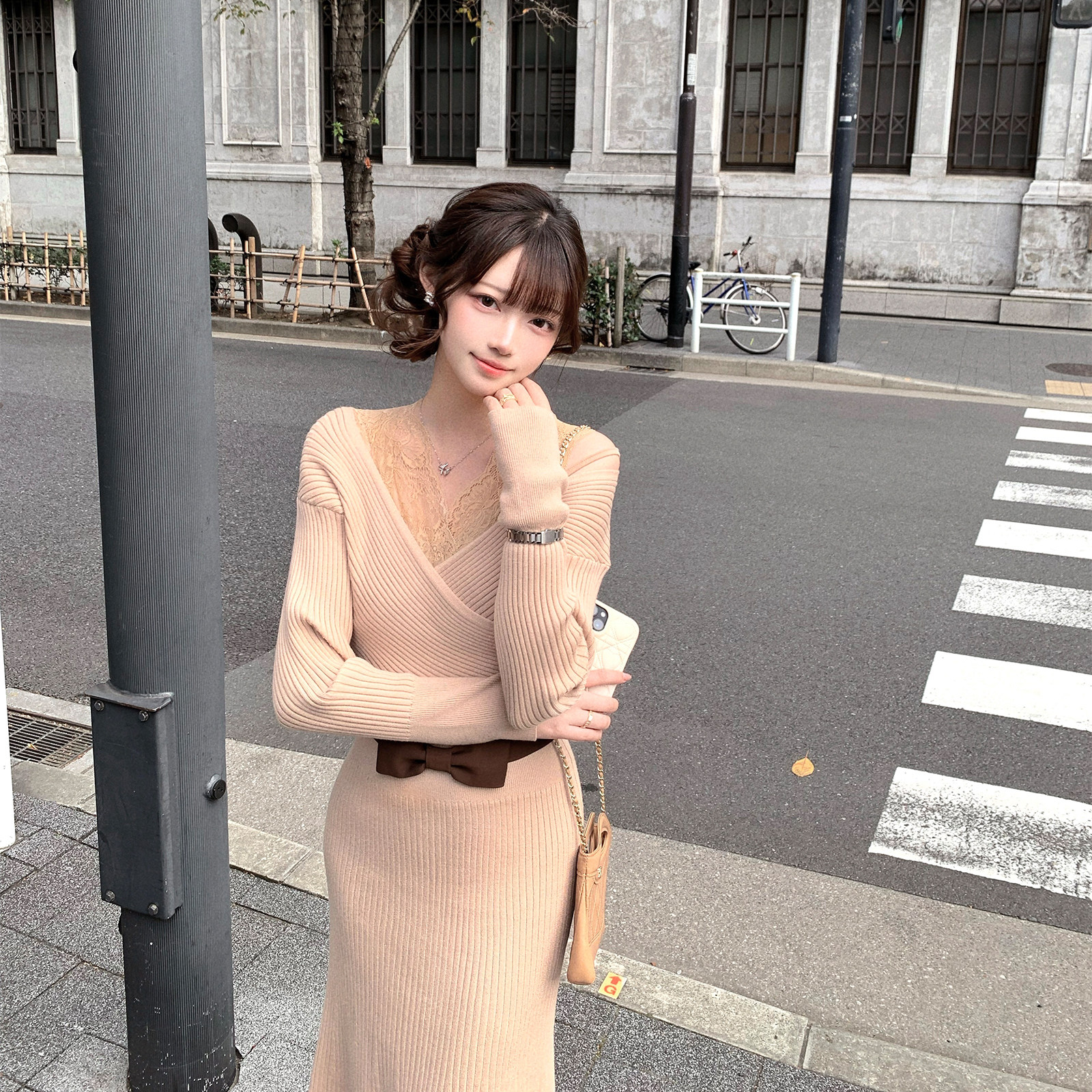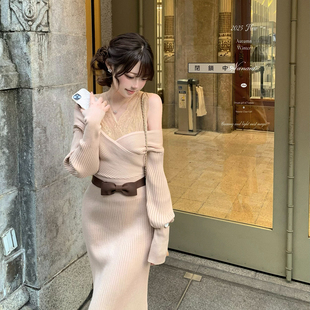 甜水仙 针织拼接蕾丝连衣裙假两件V领收腰包臀长裙 六本木约会日