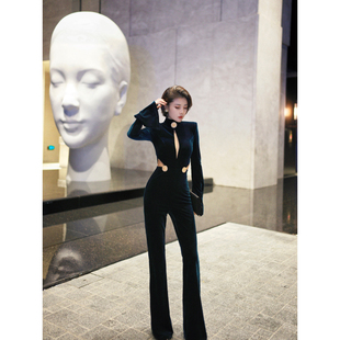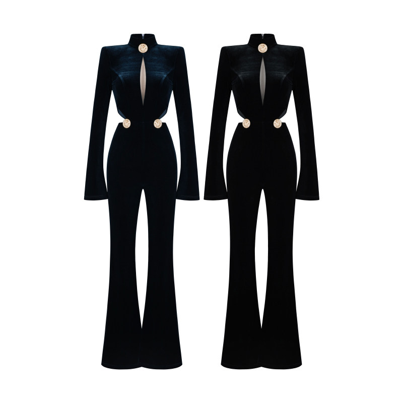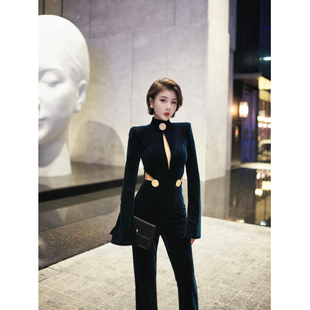XULU原创进口高定丝绒拼透视网性感镂空高腰喇叭长袖 半高领连体裤