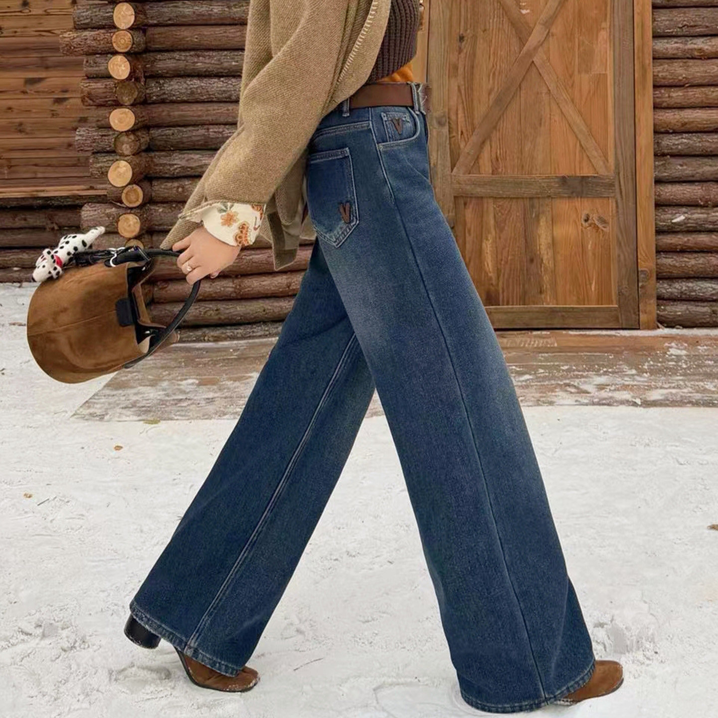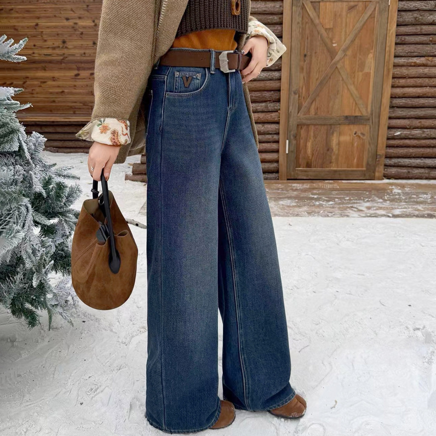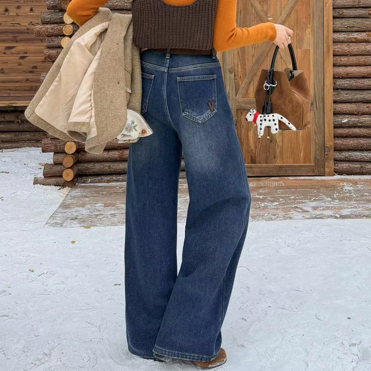 阔腿裤 秋栗裤 窄版 女秋冬新款 四面弹加绒双侧线美拉德直筒牛仔裤