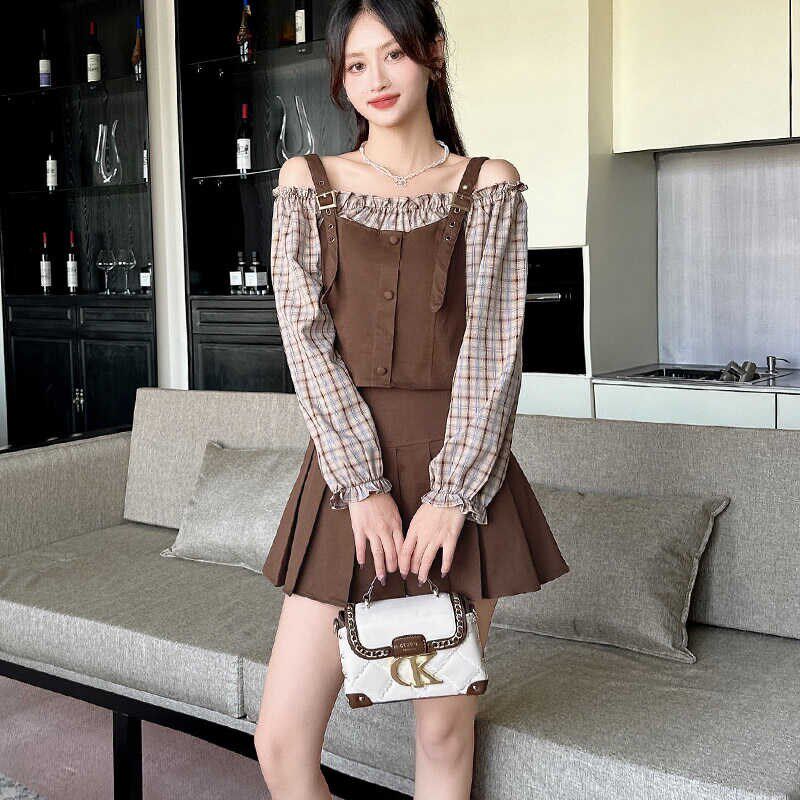 百褶裙两件套装 显瘦一字领背带假两件格子衬衫 学院风长袖 2024秋季