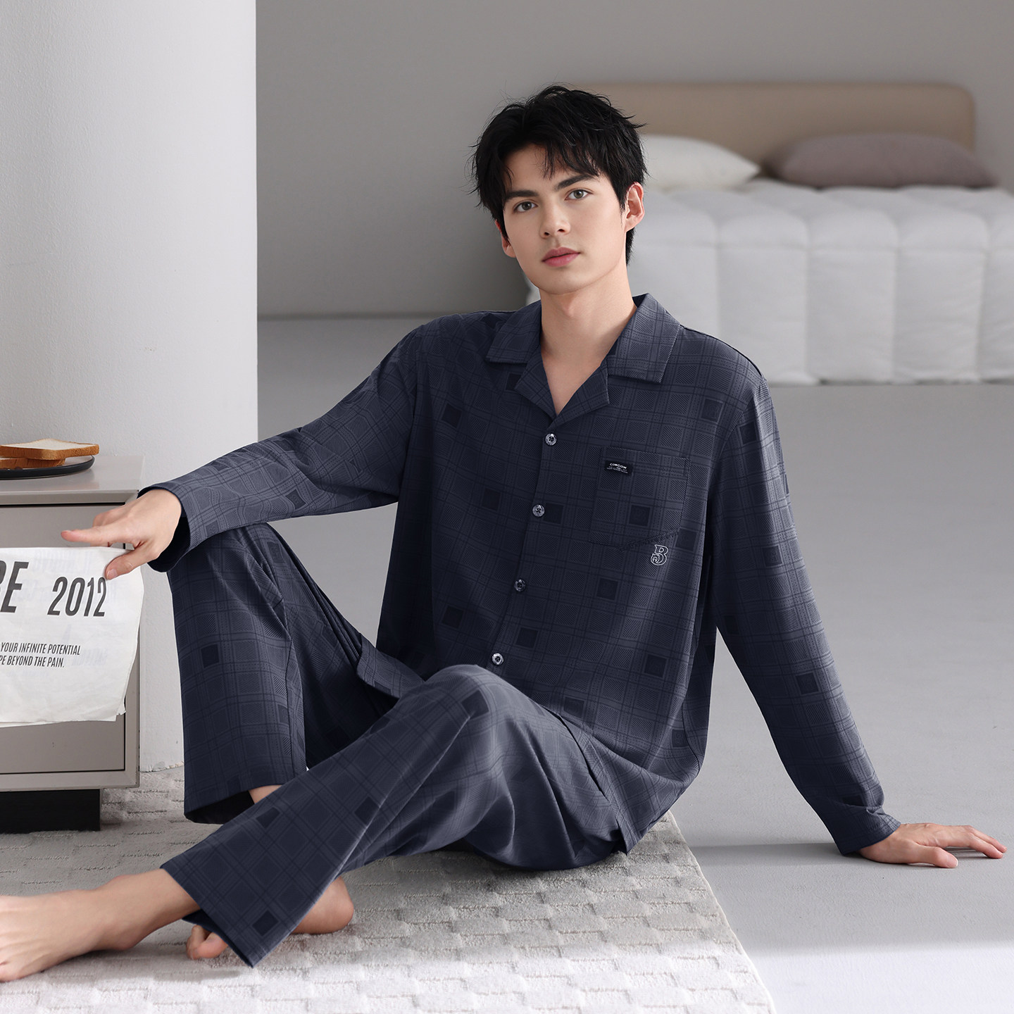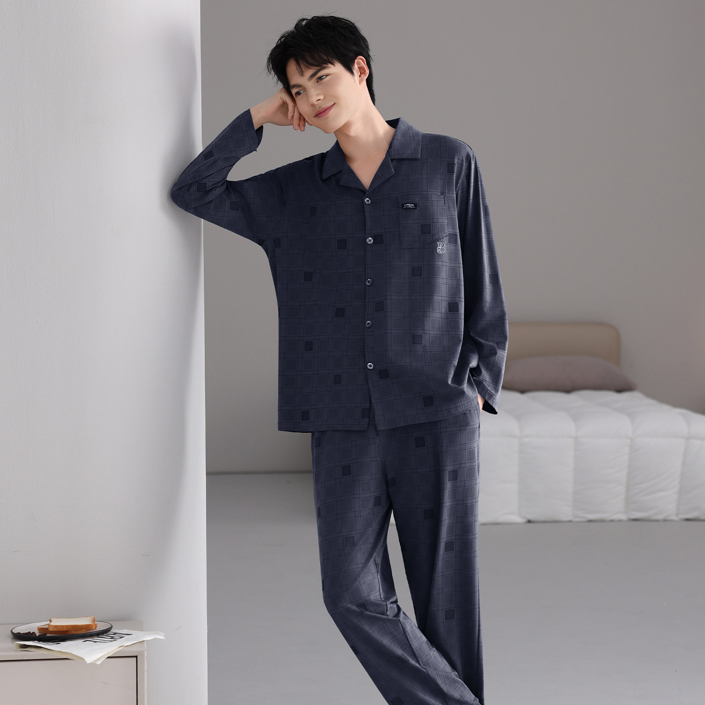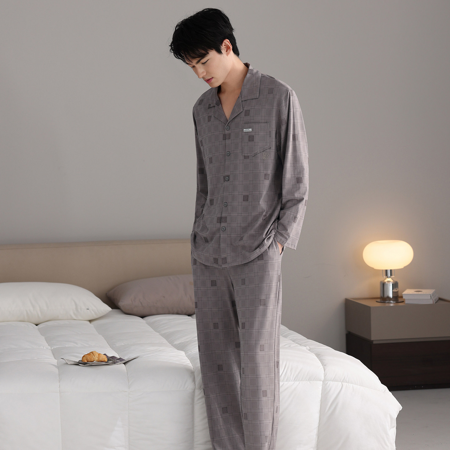 青年休闲宽松翻领格子秋季 芬腾纯棉长袖 春秋款 睡衣套装 家居服 男士