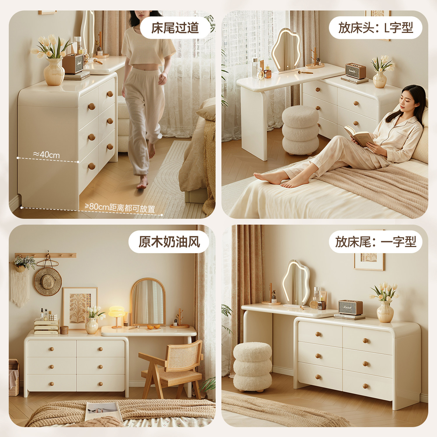 2024新款 实木梳妆台卧室现代简约奶油风床尾转角化妆桌斗柜一体