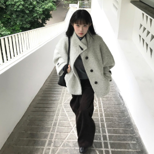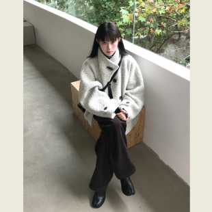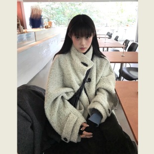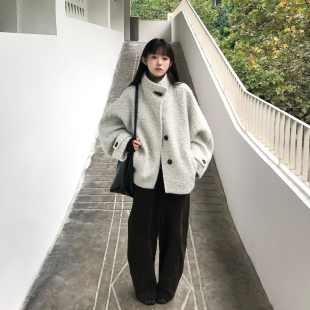 云白色廓形立领圈圈毛外套女秋冬新款 呢子大衣 慵懒风小个子短款