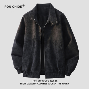 潮 宽松痞帅PU皮夹克青少年款 ponchioe美式 潮牌复古立领外套男秋季