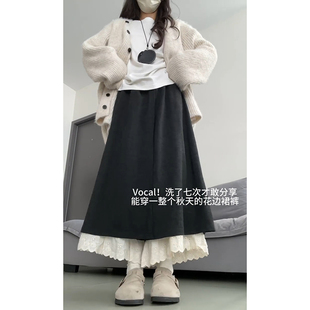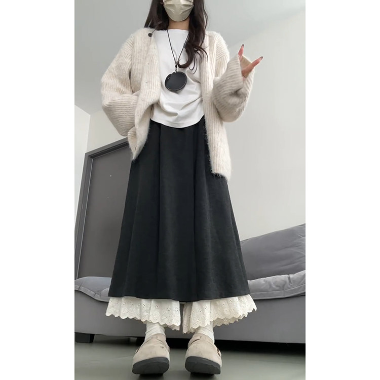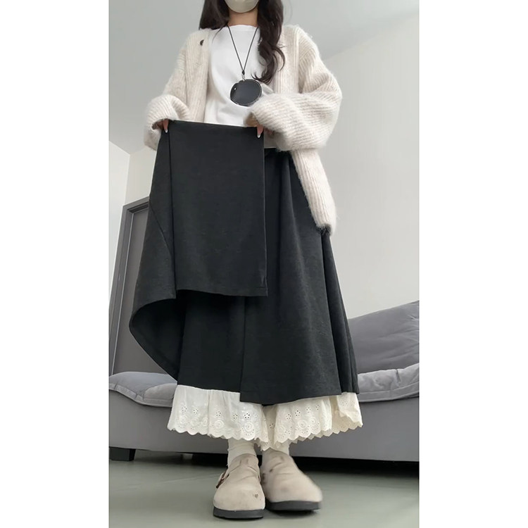 小众高腰拼接阔腿裙裤 深灰色蕾丝花边休闲裤 时尚 2025新款 女秋冬季