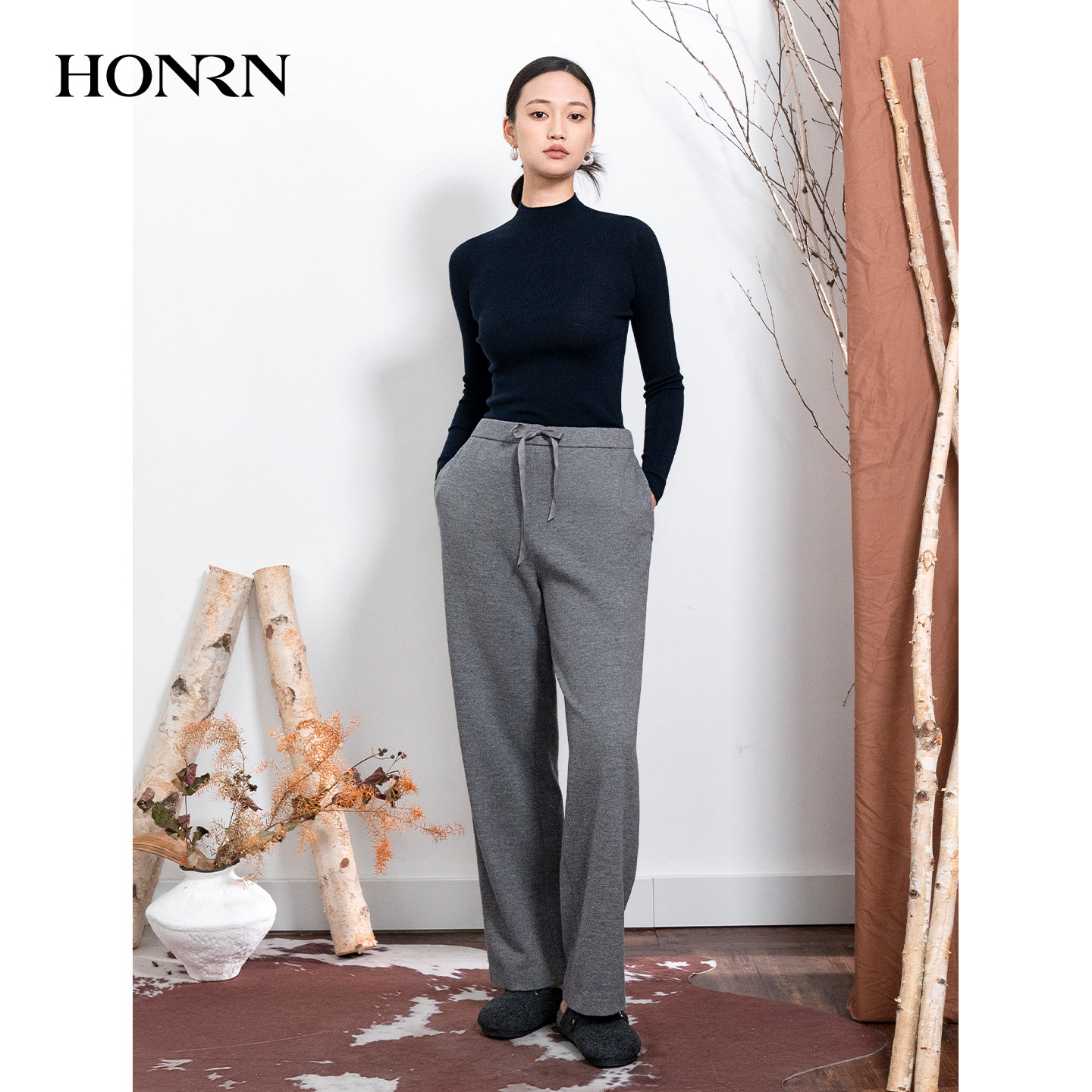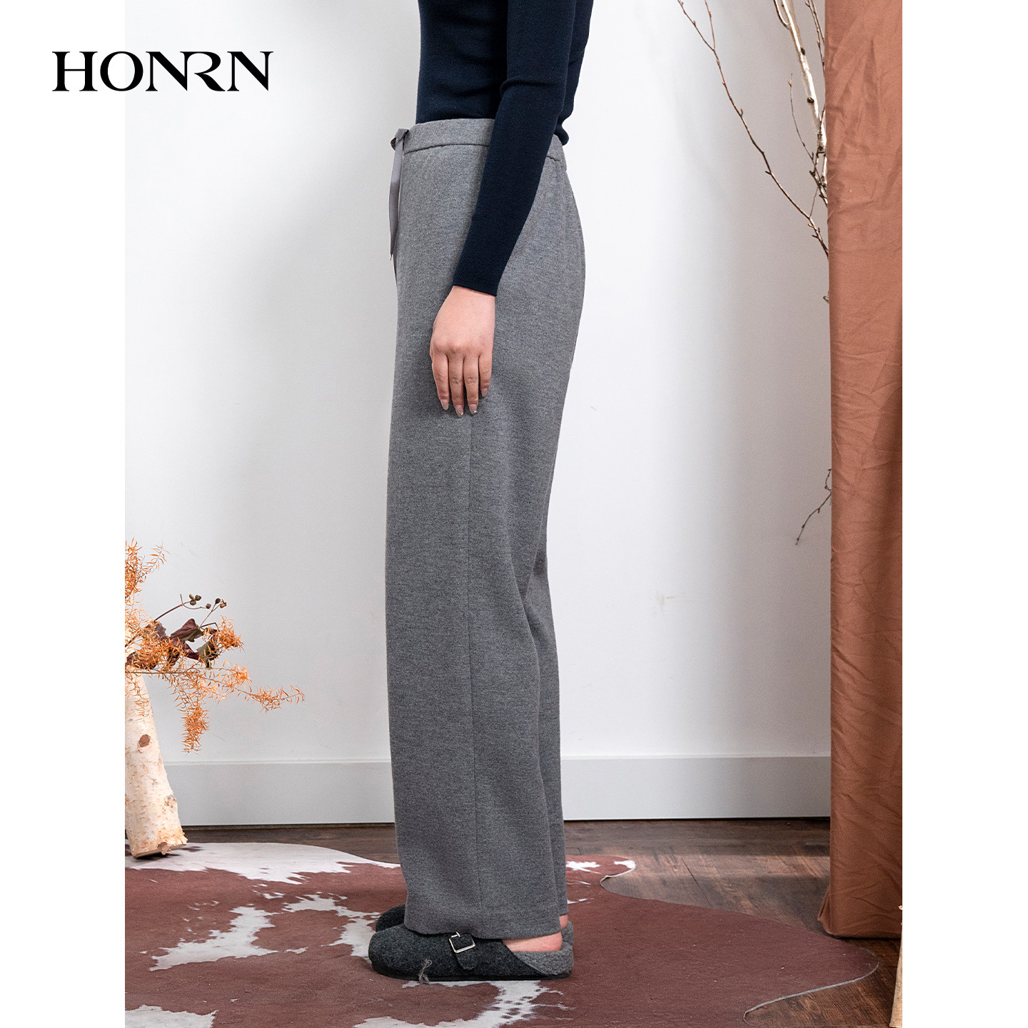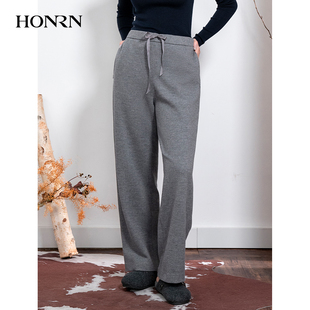 HONRN 女秋冬HI55OK008 红人抽绳收腰羊毛棉混纺直筒阔腿休闲裤
