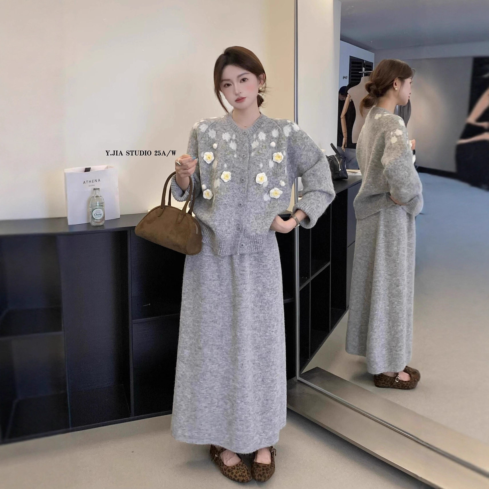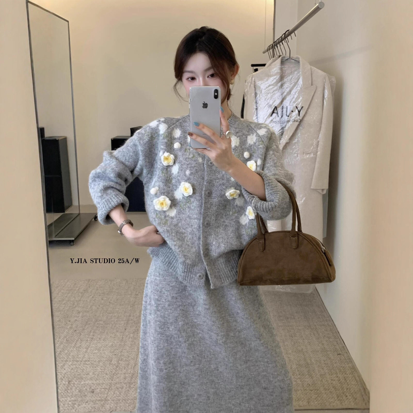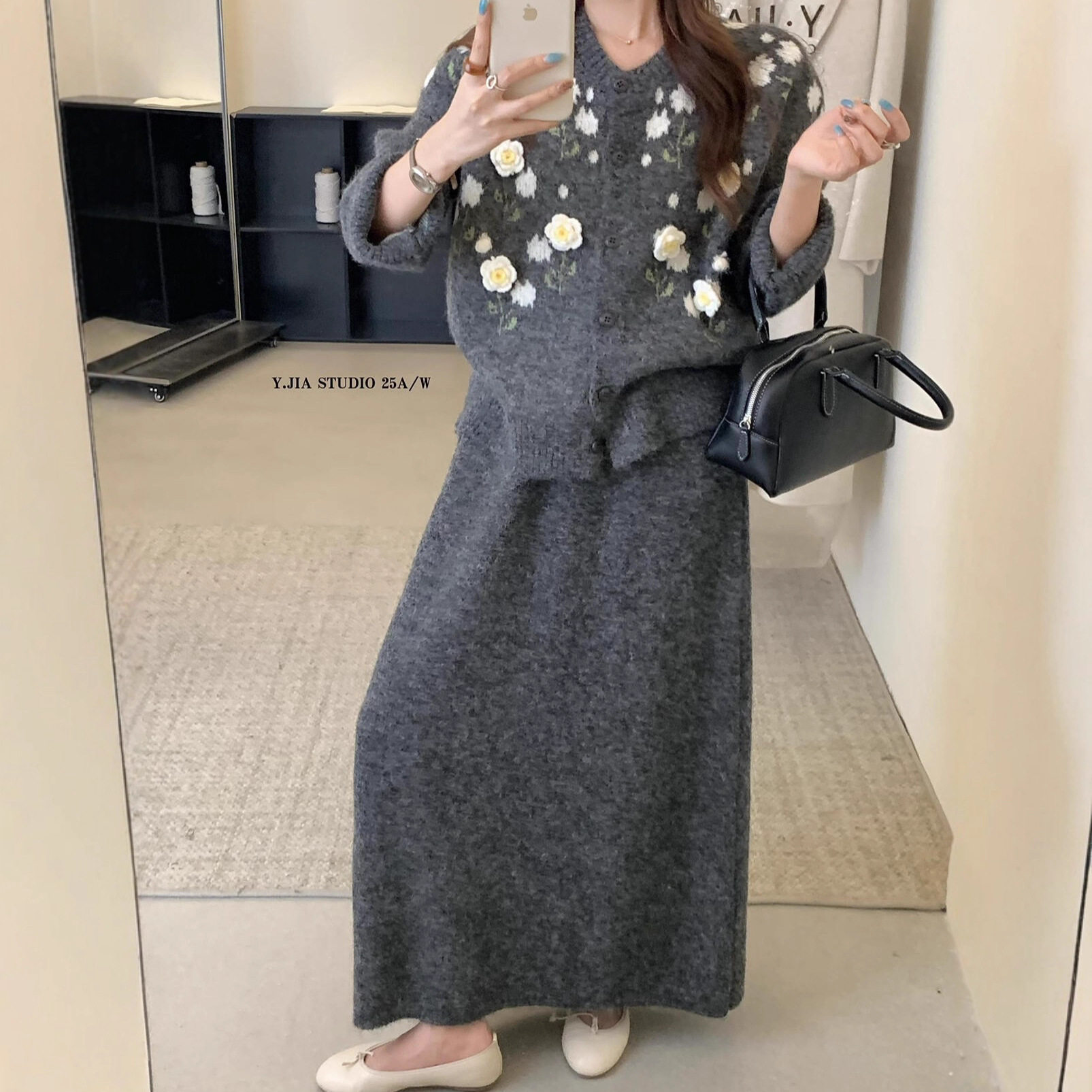 高腰A字半身裙两件套装 秋冬韩系立体钩花针织衫 女831 伊嘉 YJIA